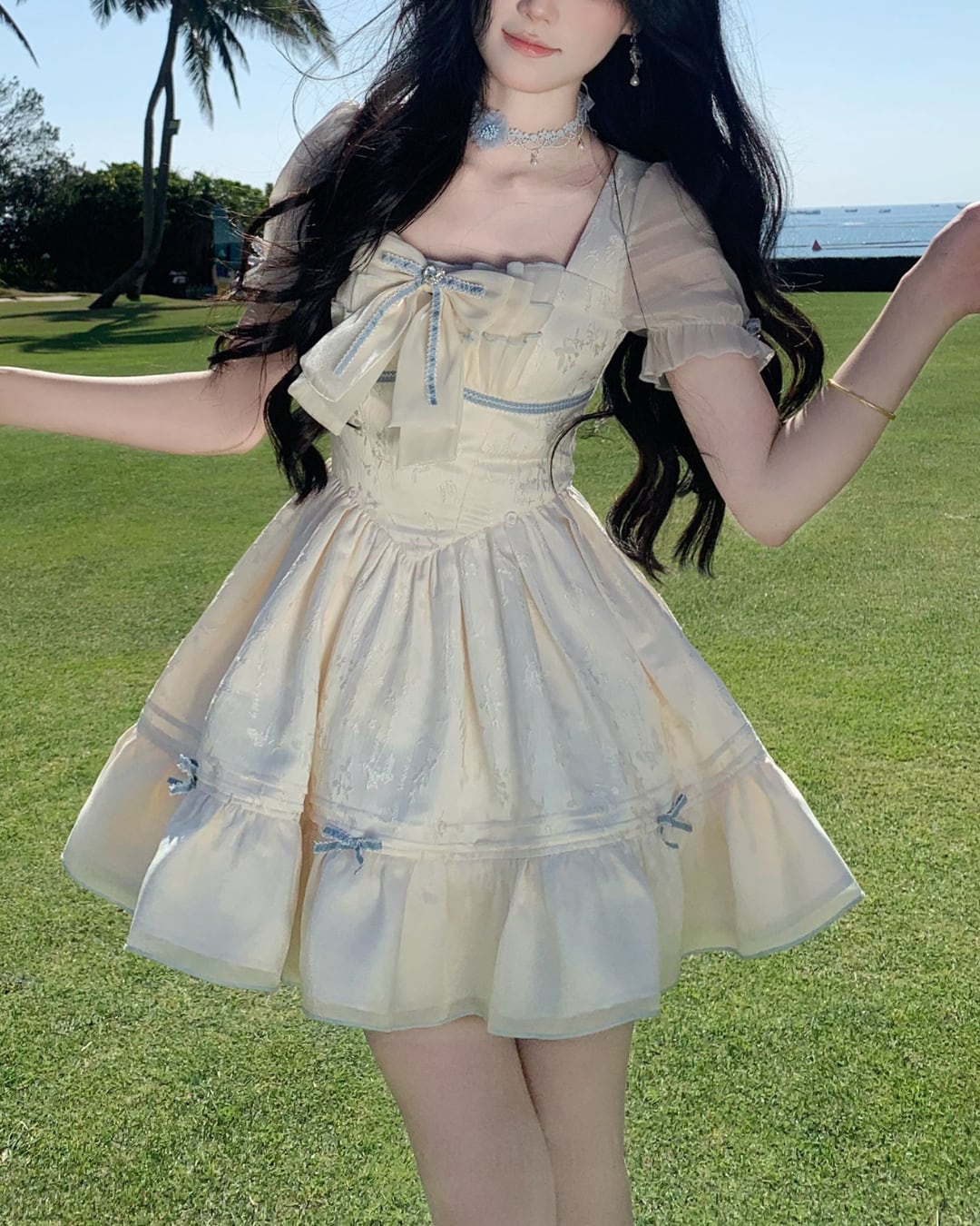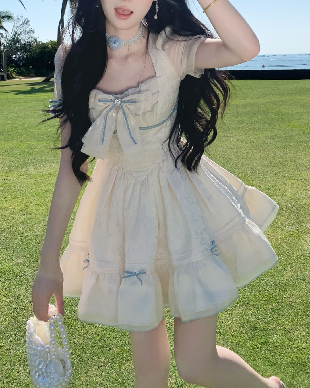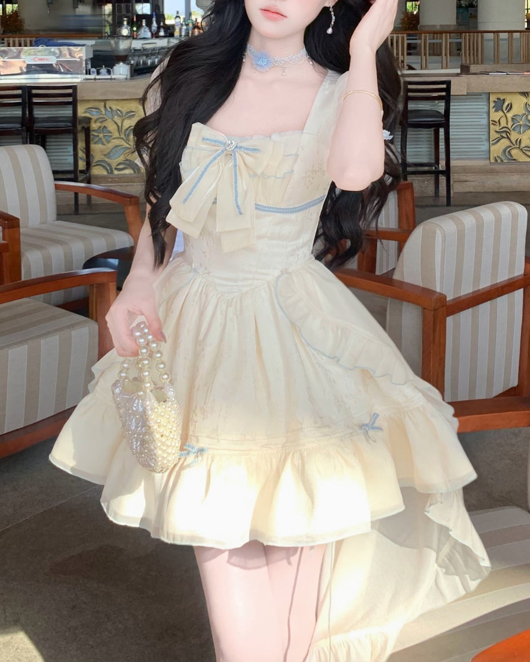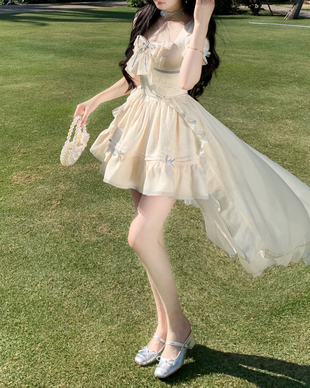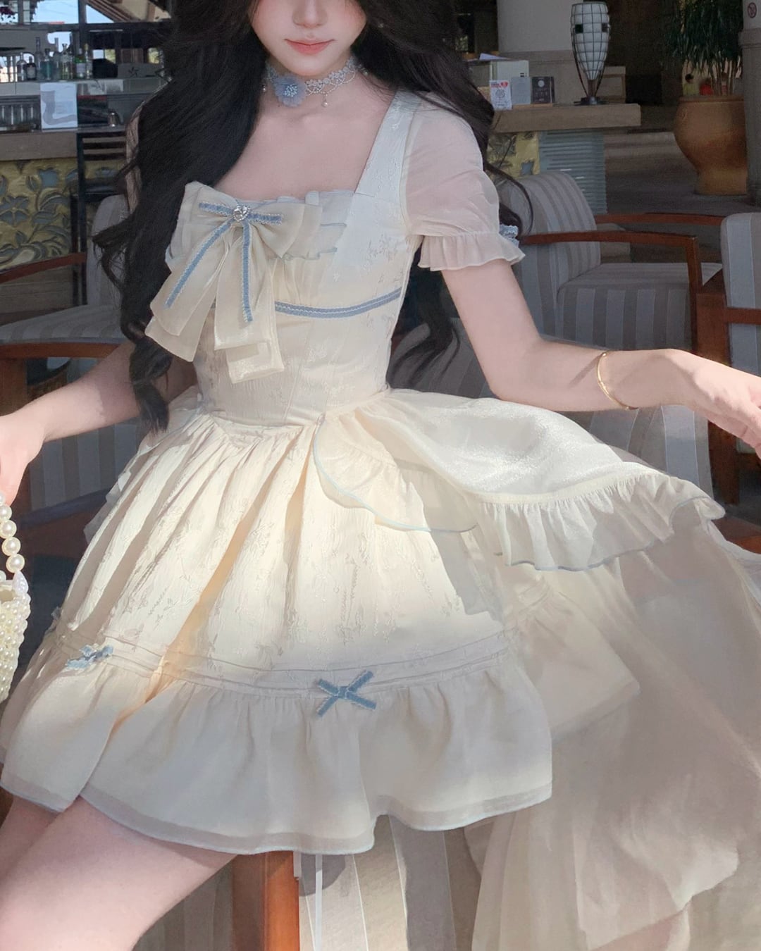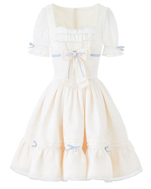 淡いクリームカラーにリボンディテールが映えるフェミニンワンピース♡