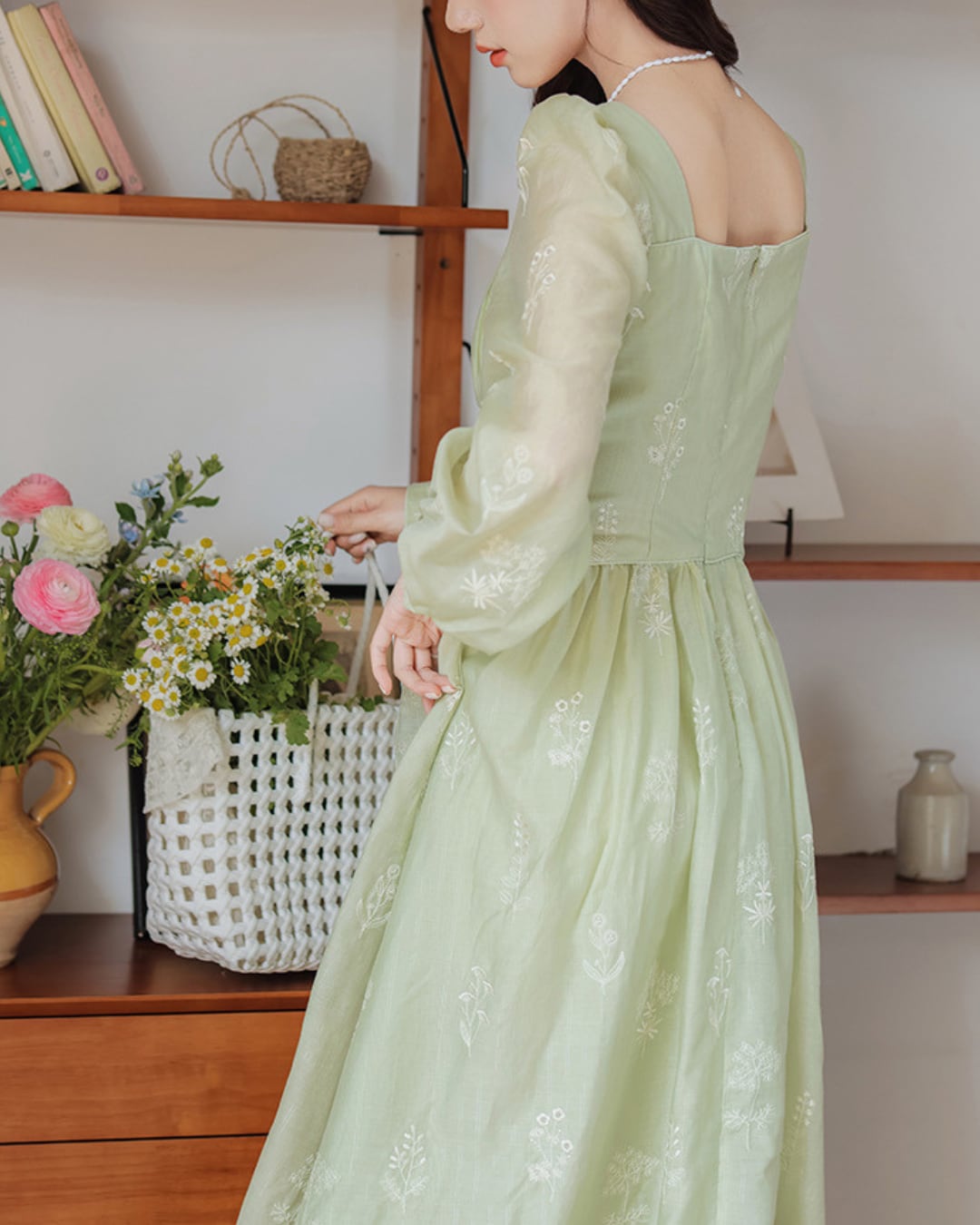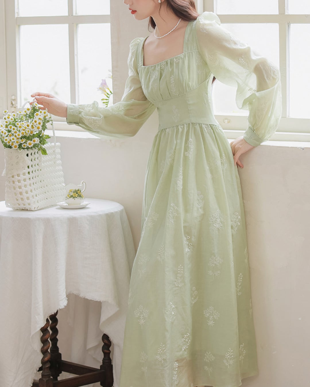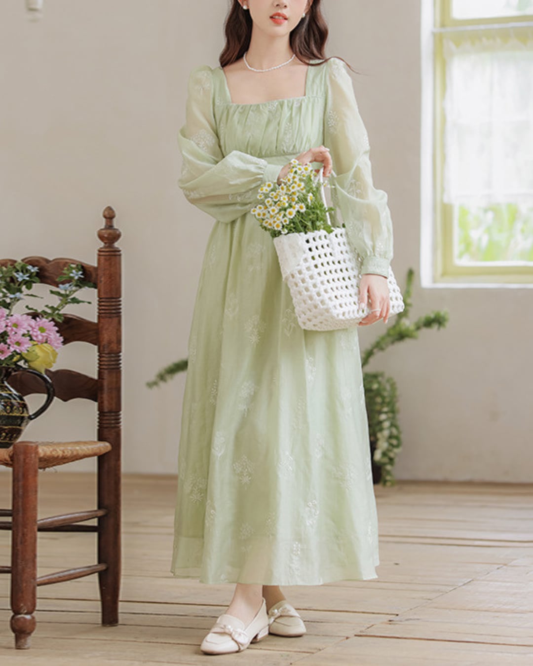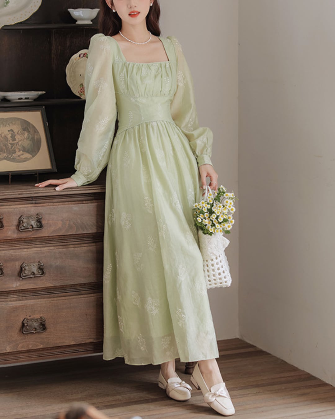 スクエアネックとシアー素材のふんわり袖が柔らかく女性らしい印象に*.゜