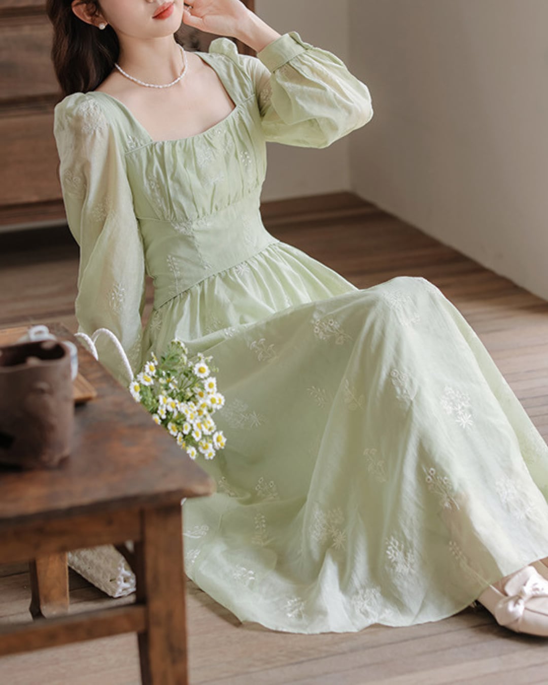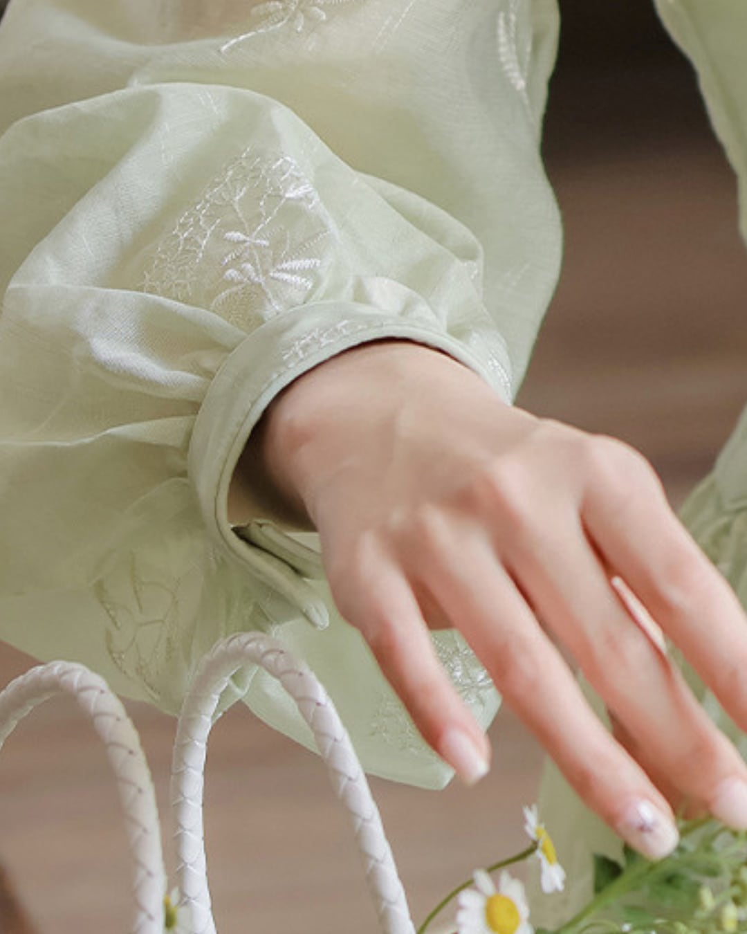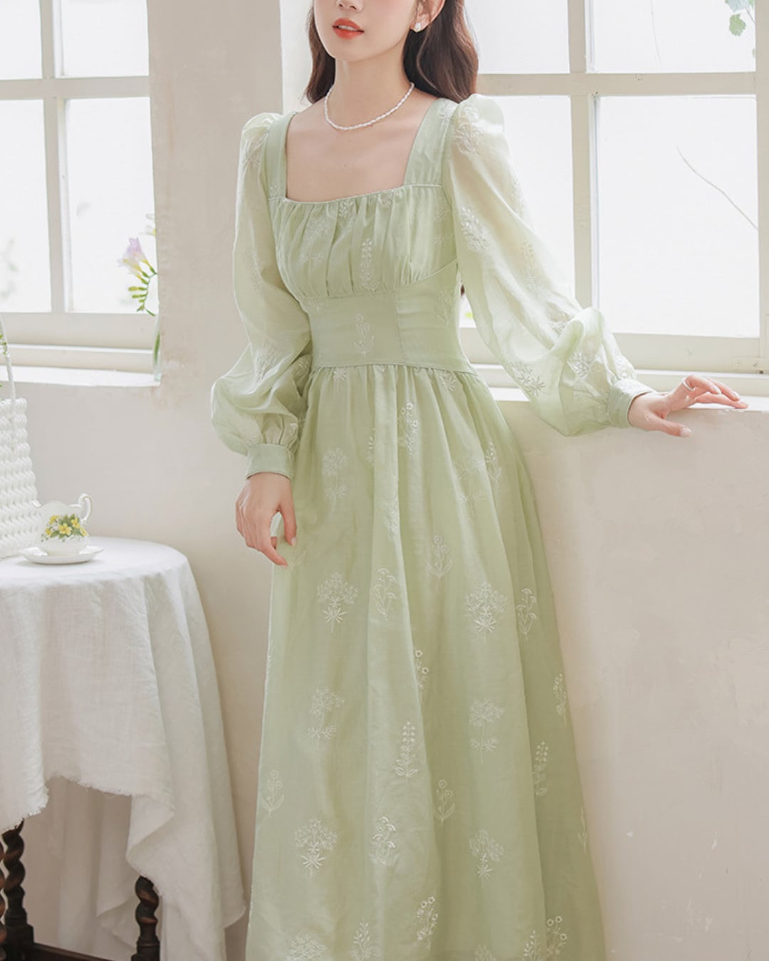 スクエアネックとシアー素材のふんわり袖が柔らかく女性らしい印象に*.゜
