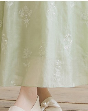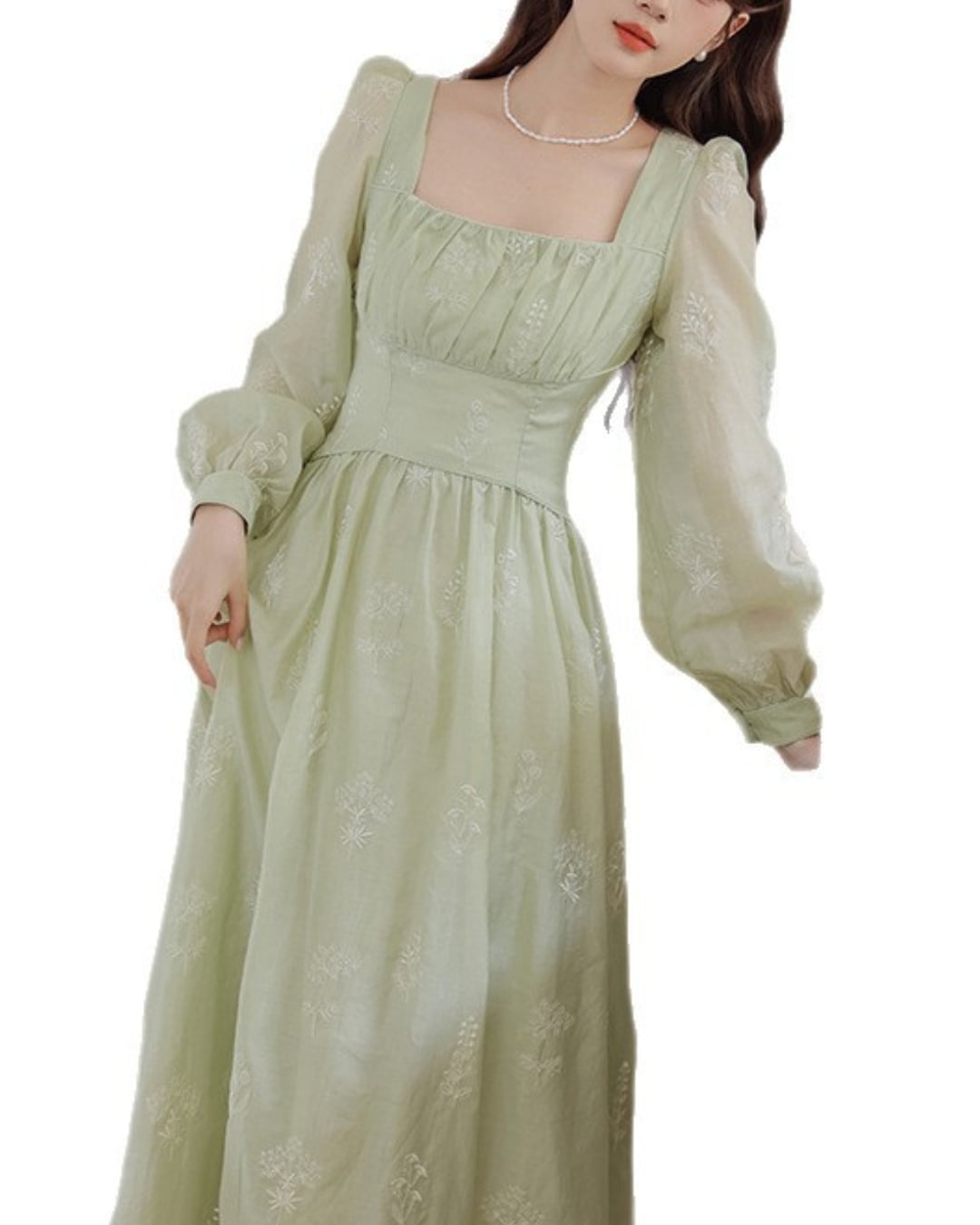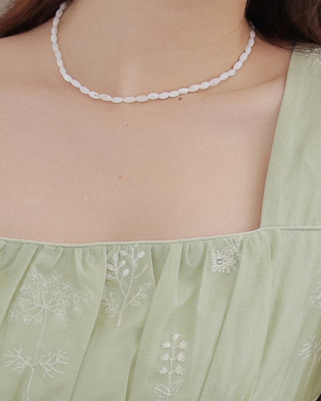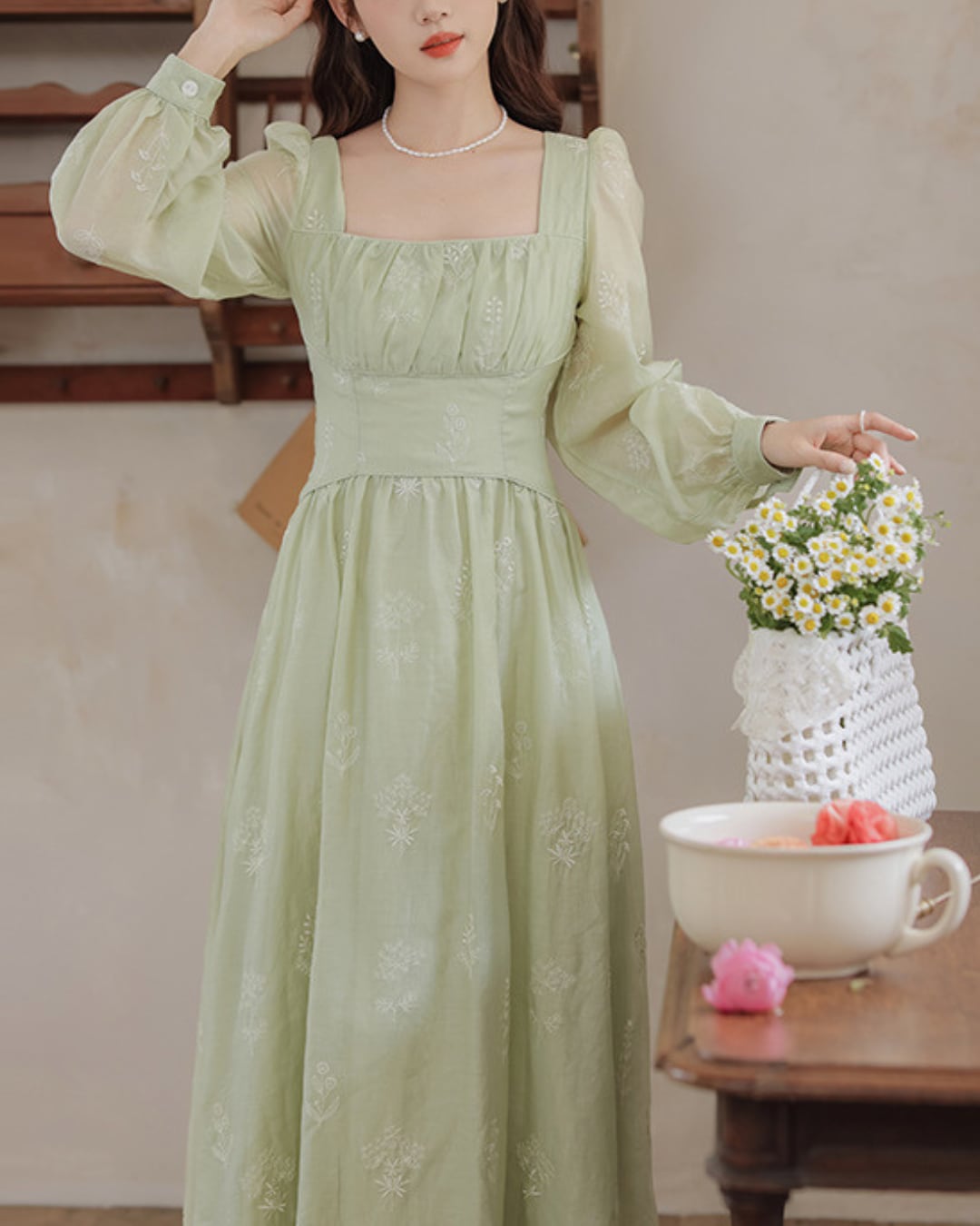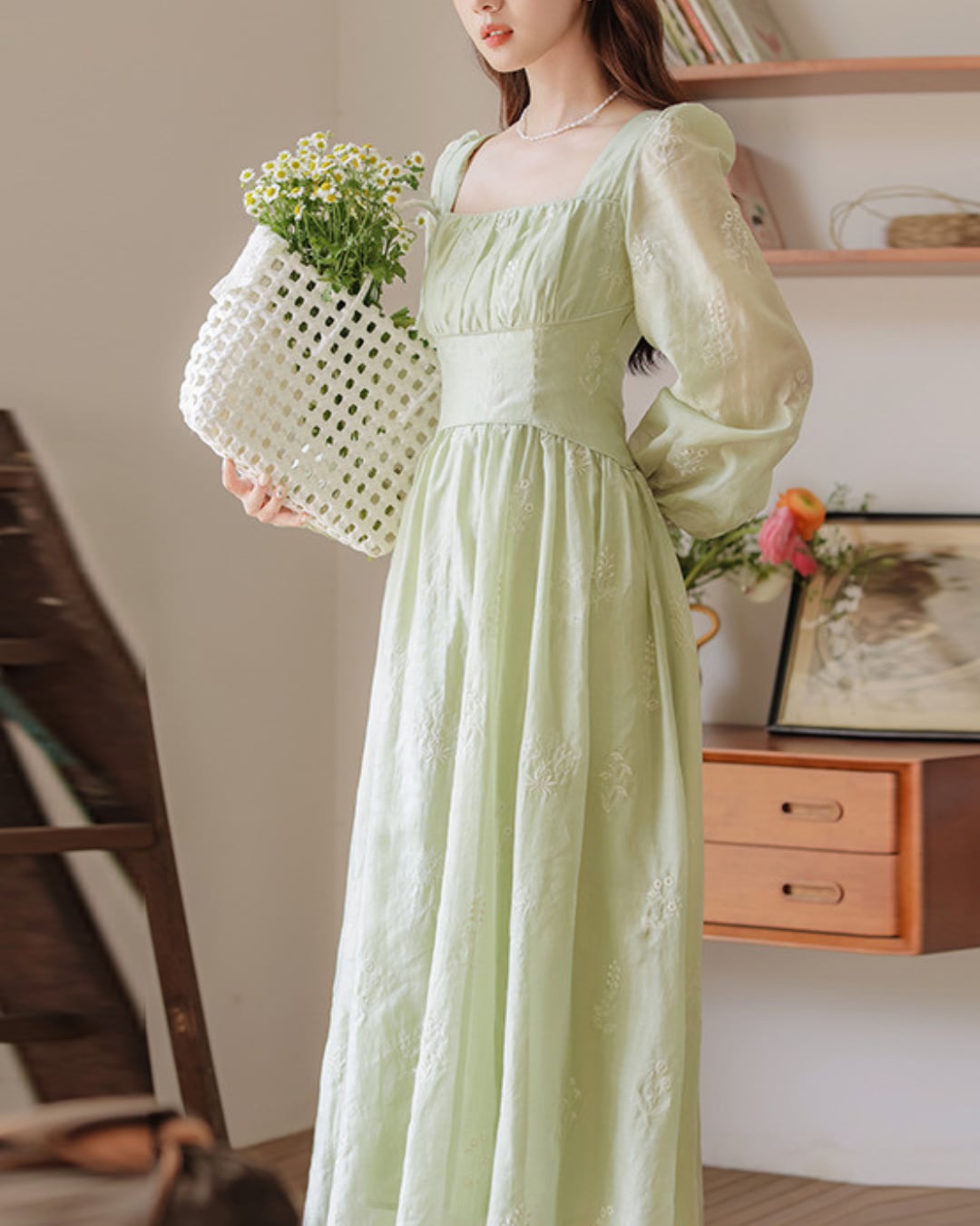 スクエアネックとシアー素材のふんわり袖が柔らかく女性らしい印象に*.゜