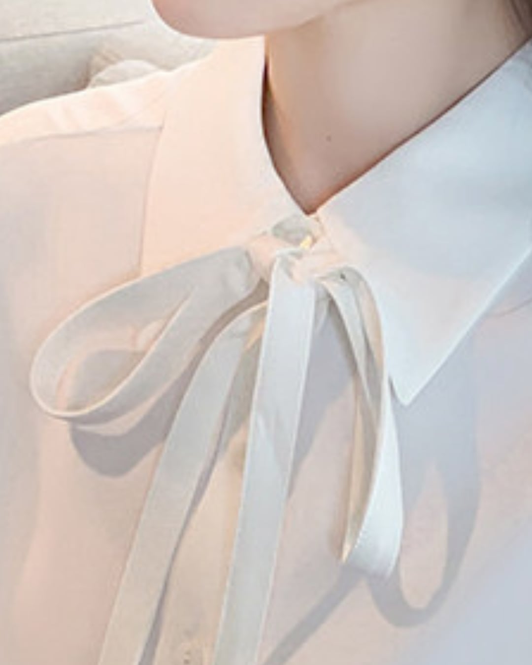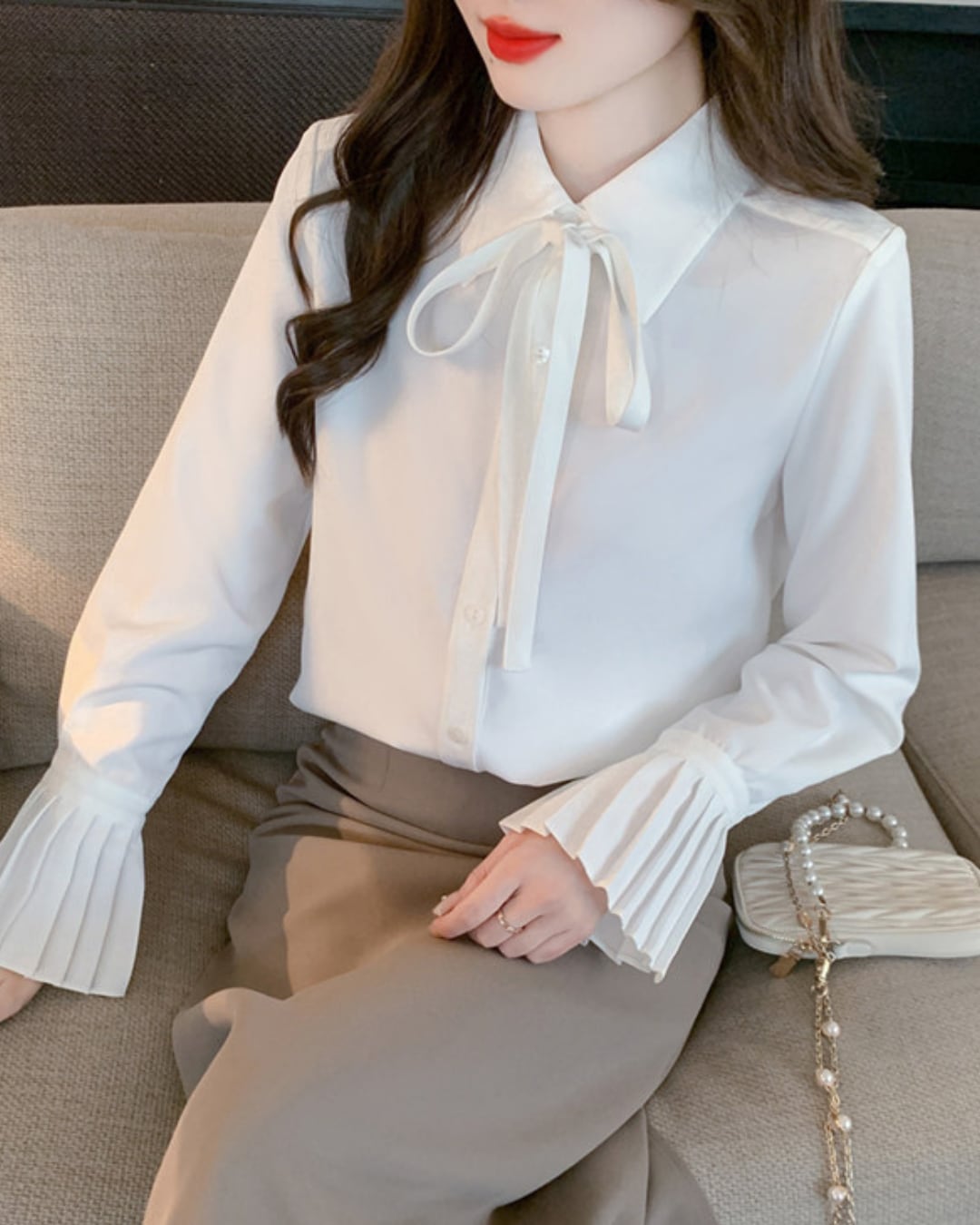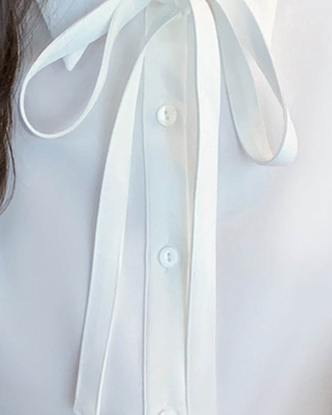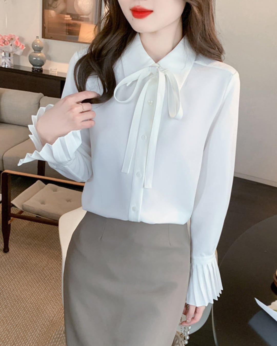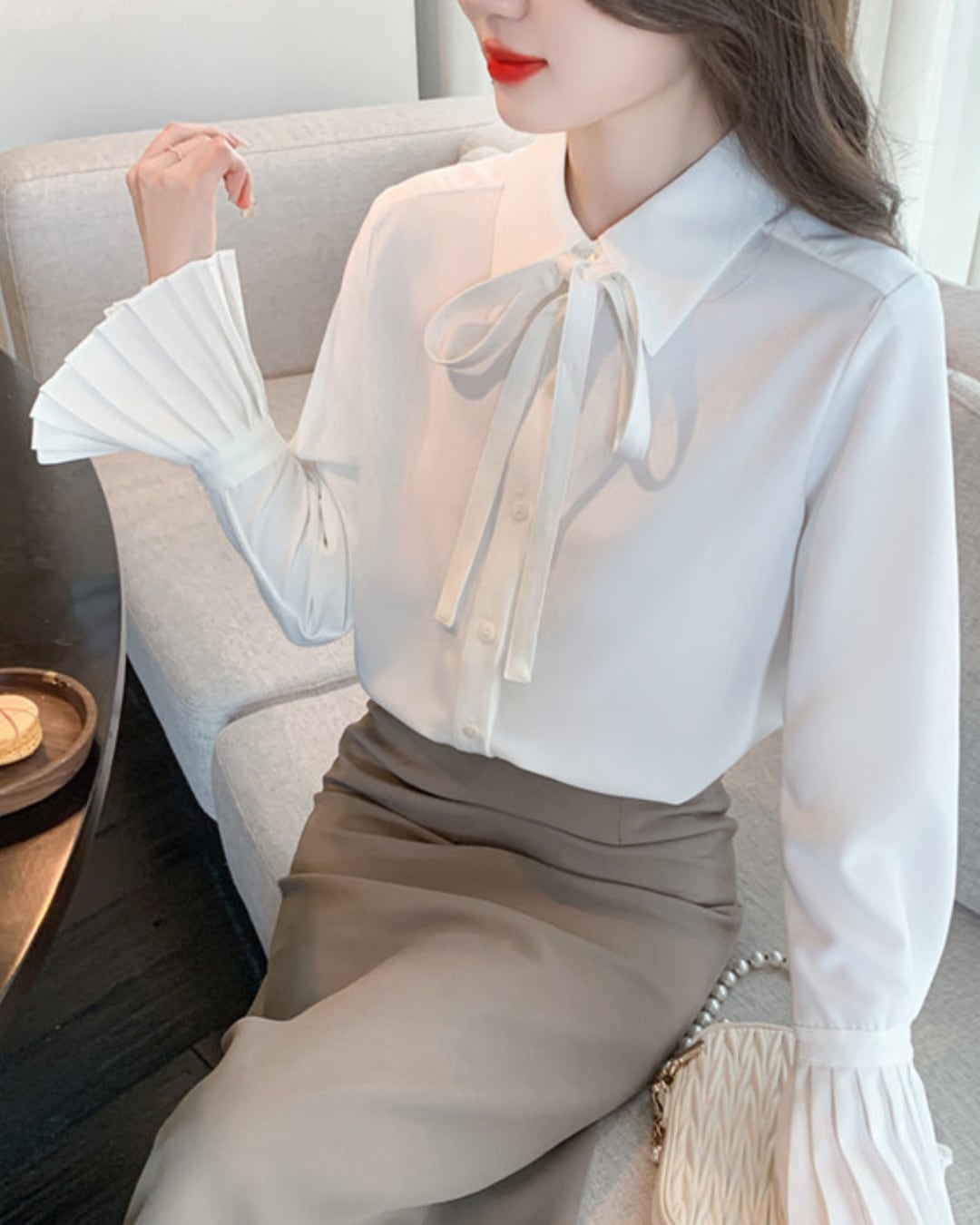 ボウタイリボンとプリーツスリーブが上品な印象を与えてくれるブラウス♡