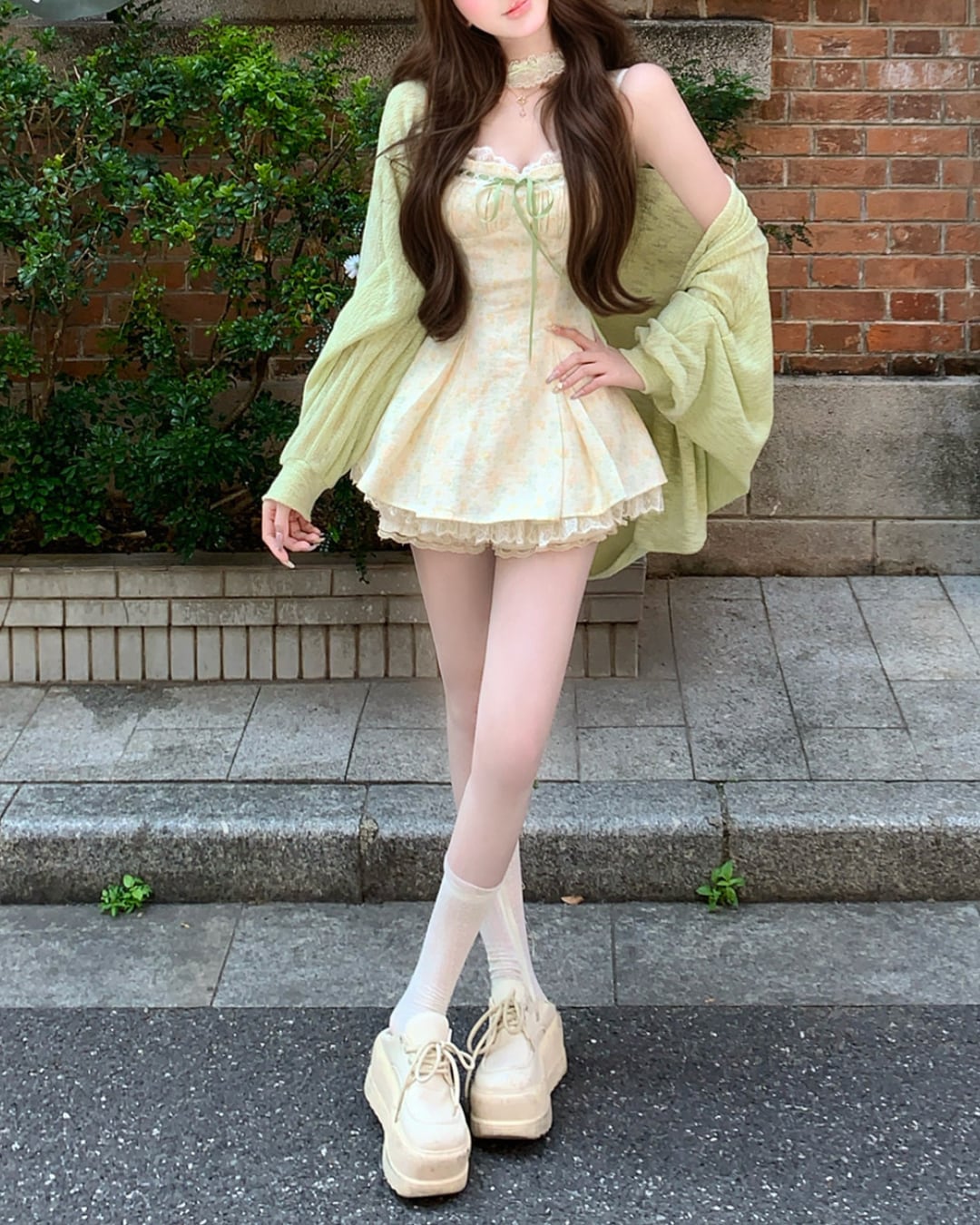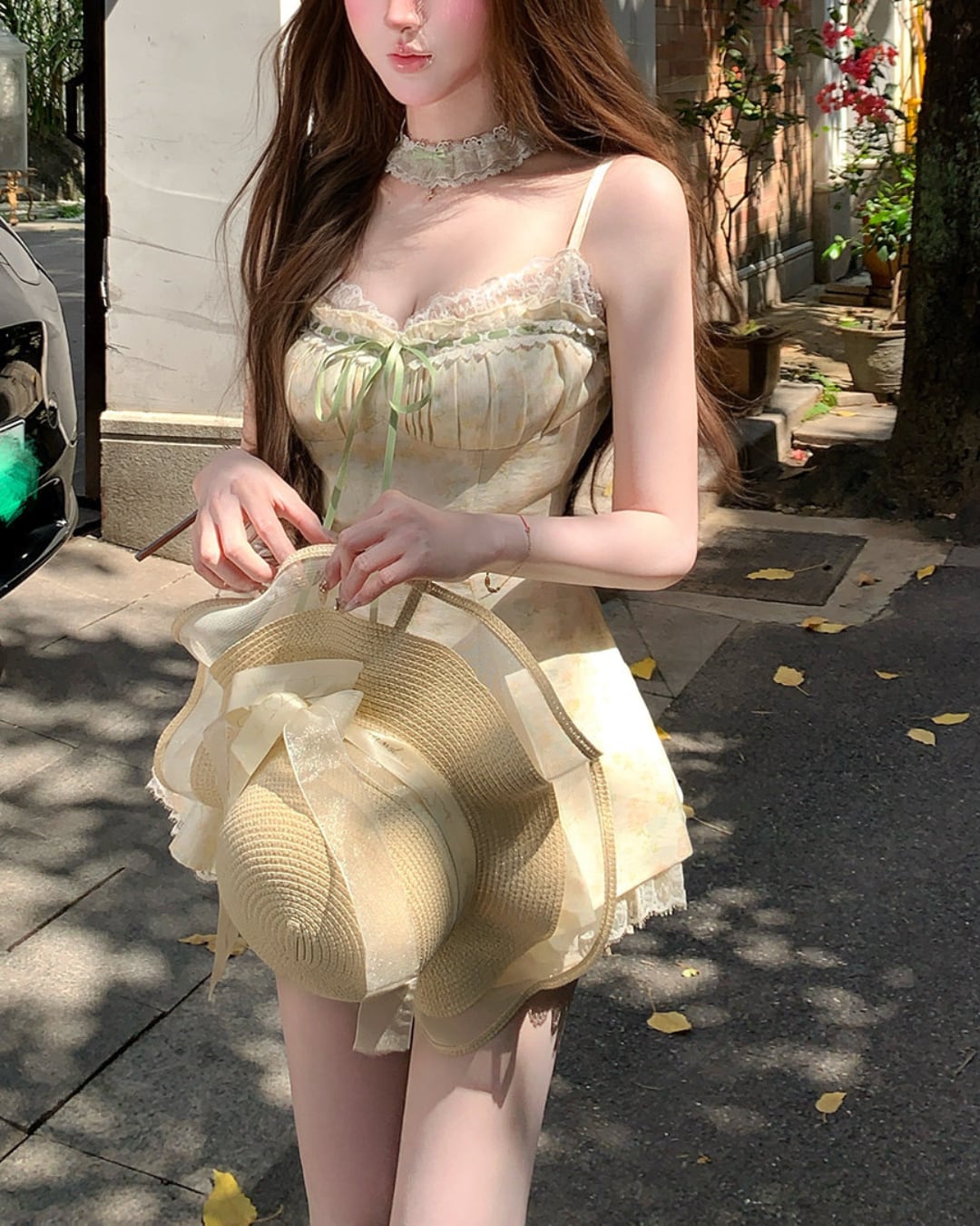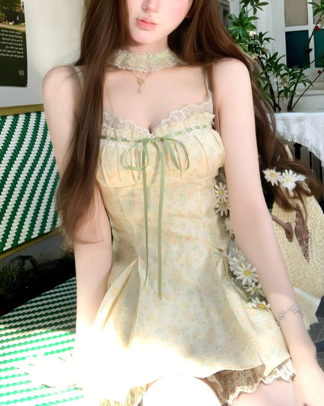 レース×グリーンのリボンがフェミニンな印象を引き立てます*・゚