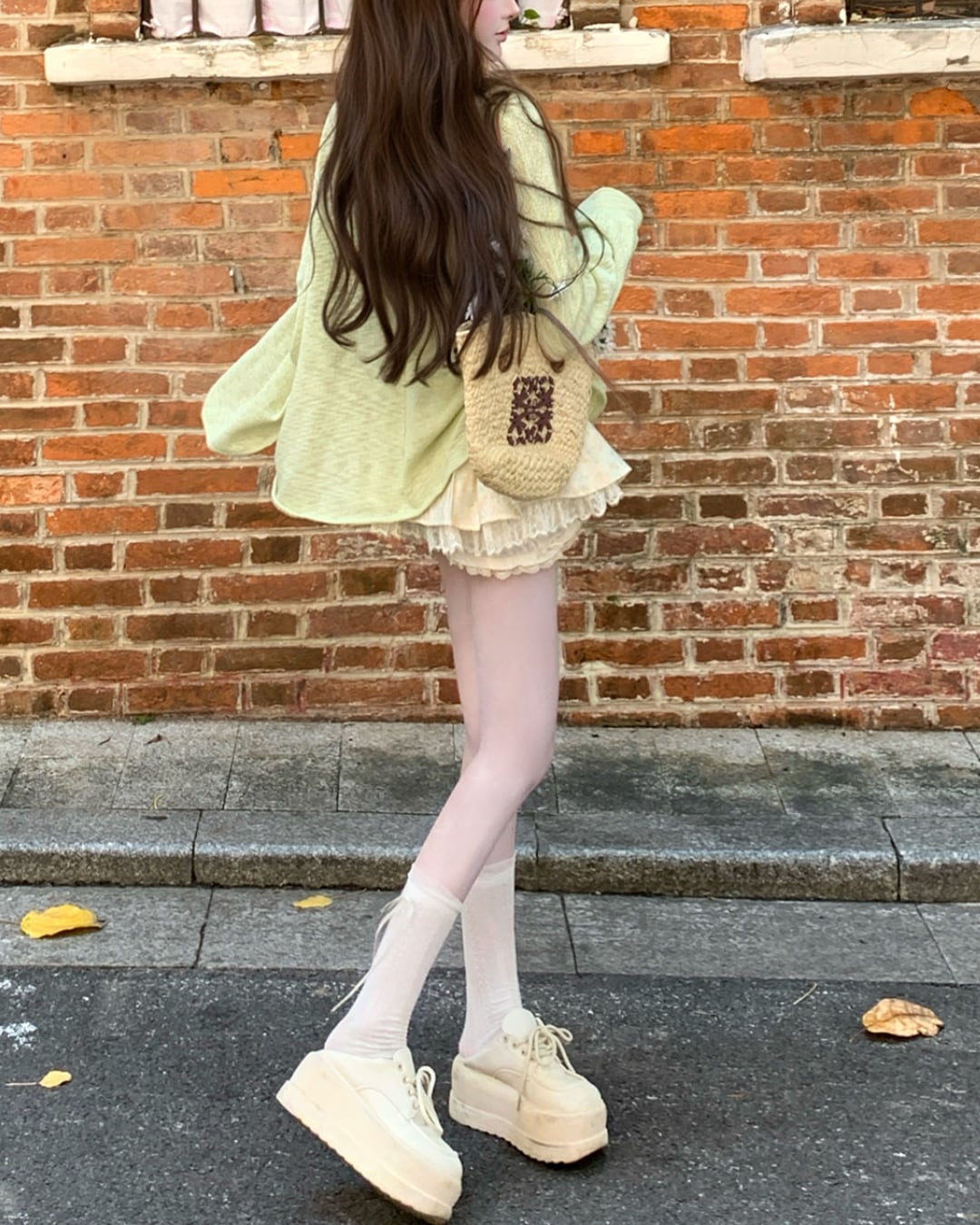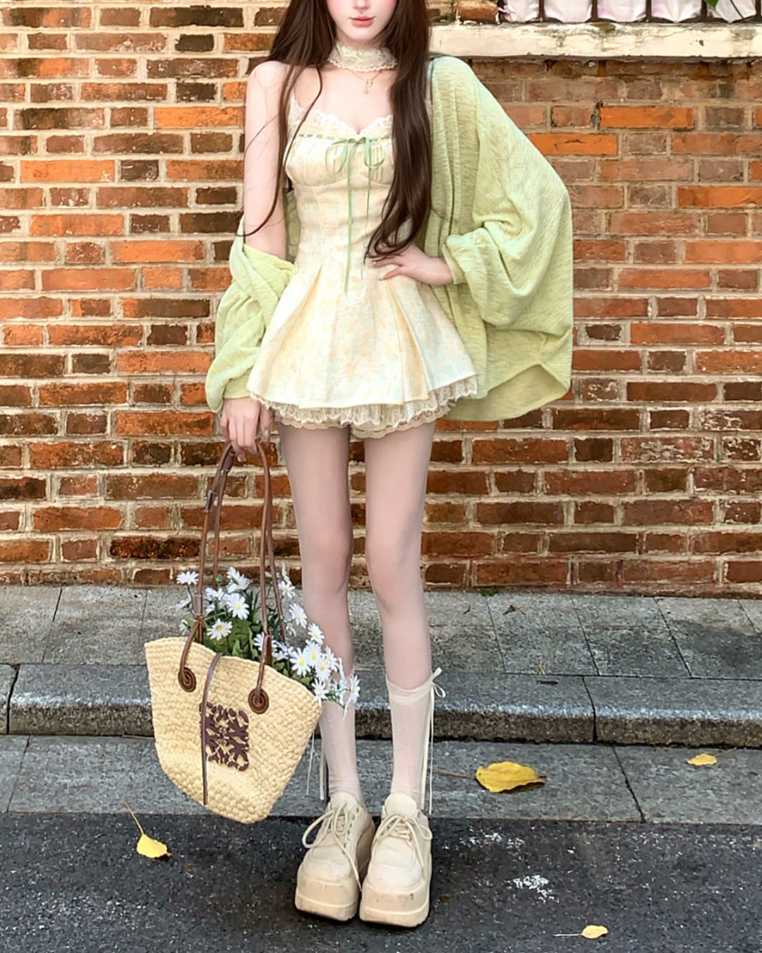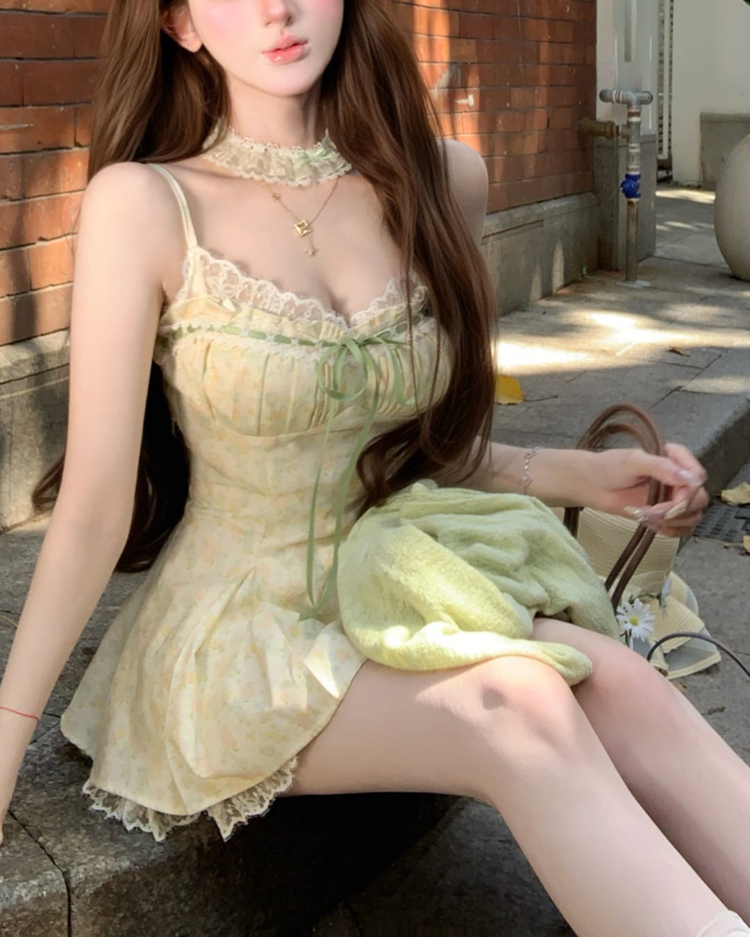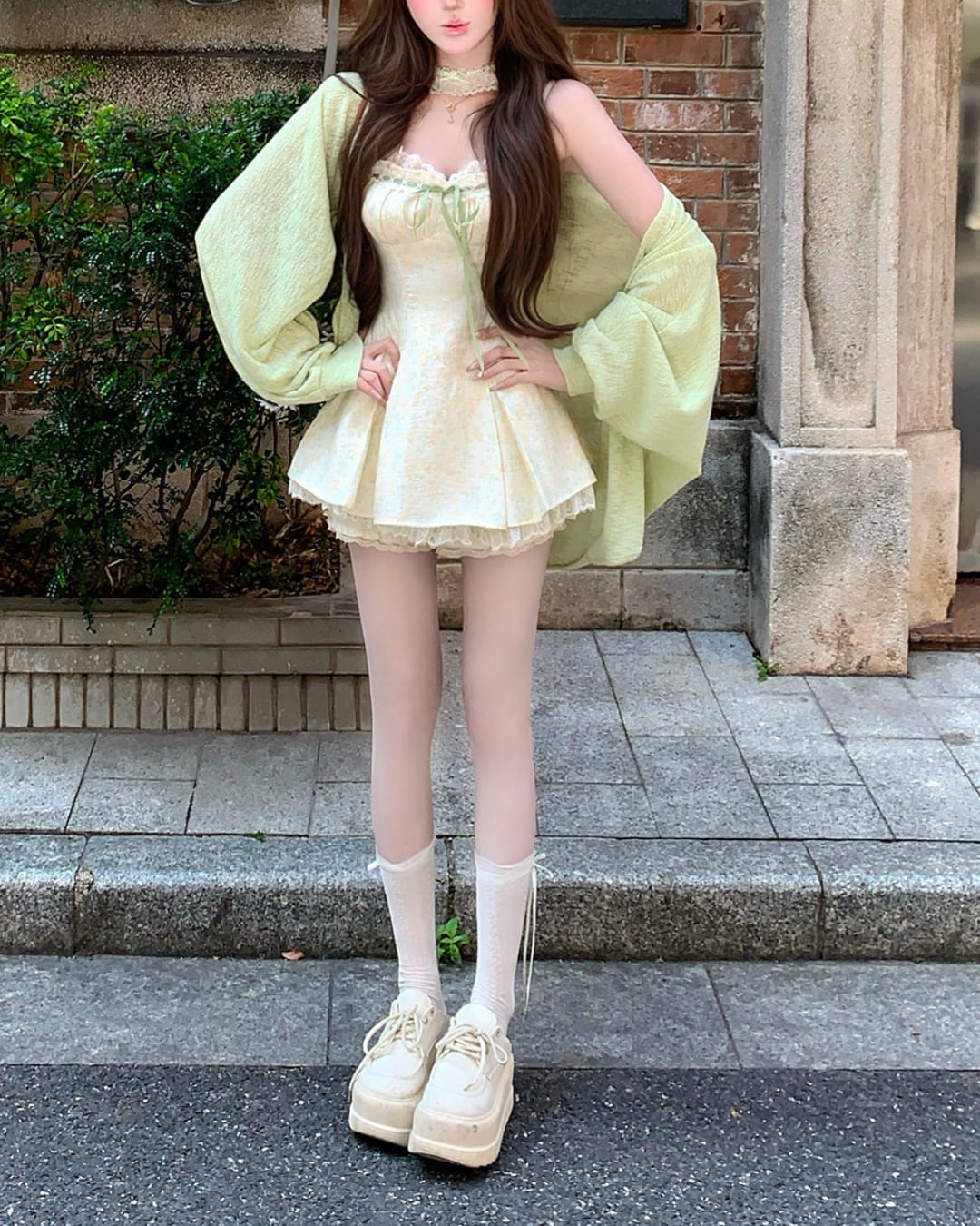 レース×グリーンのリボンがフェミニンな印象を引き立てます*・゚