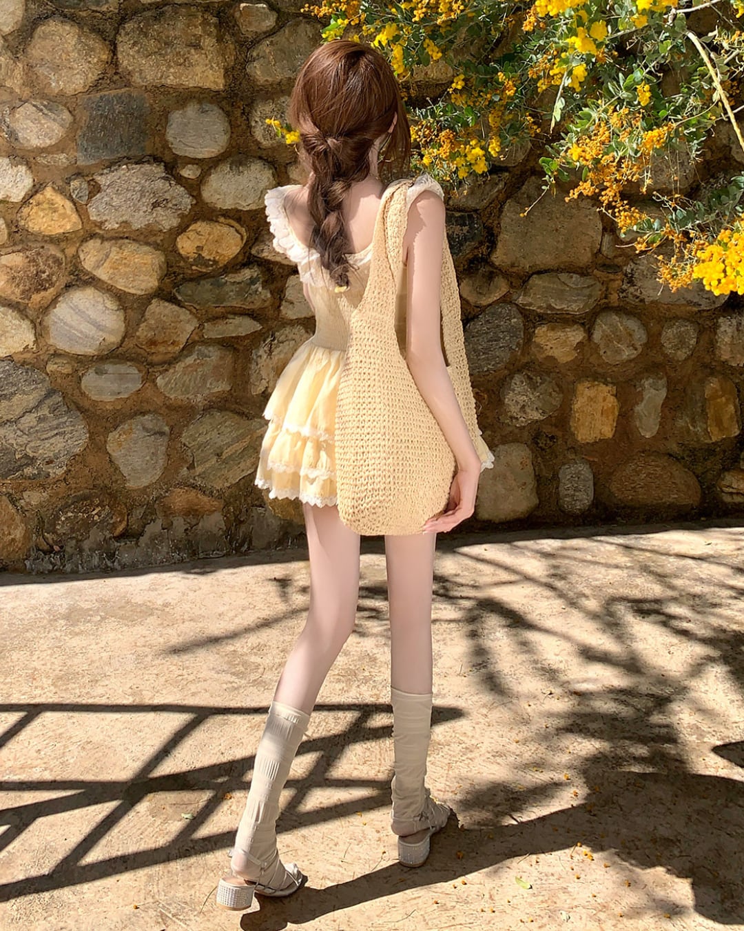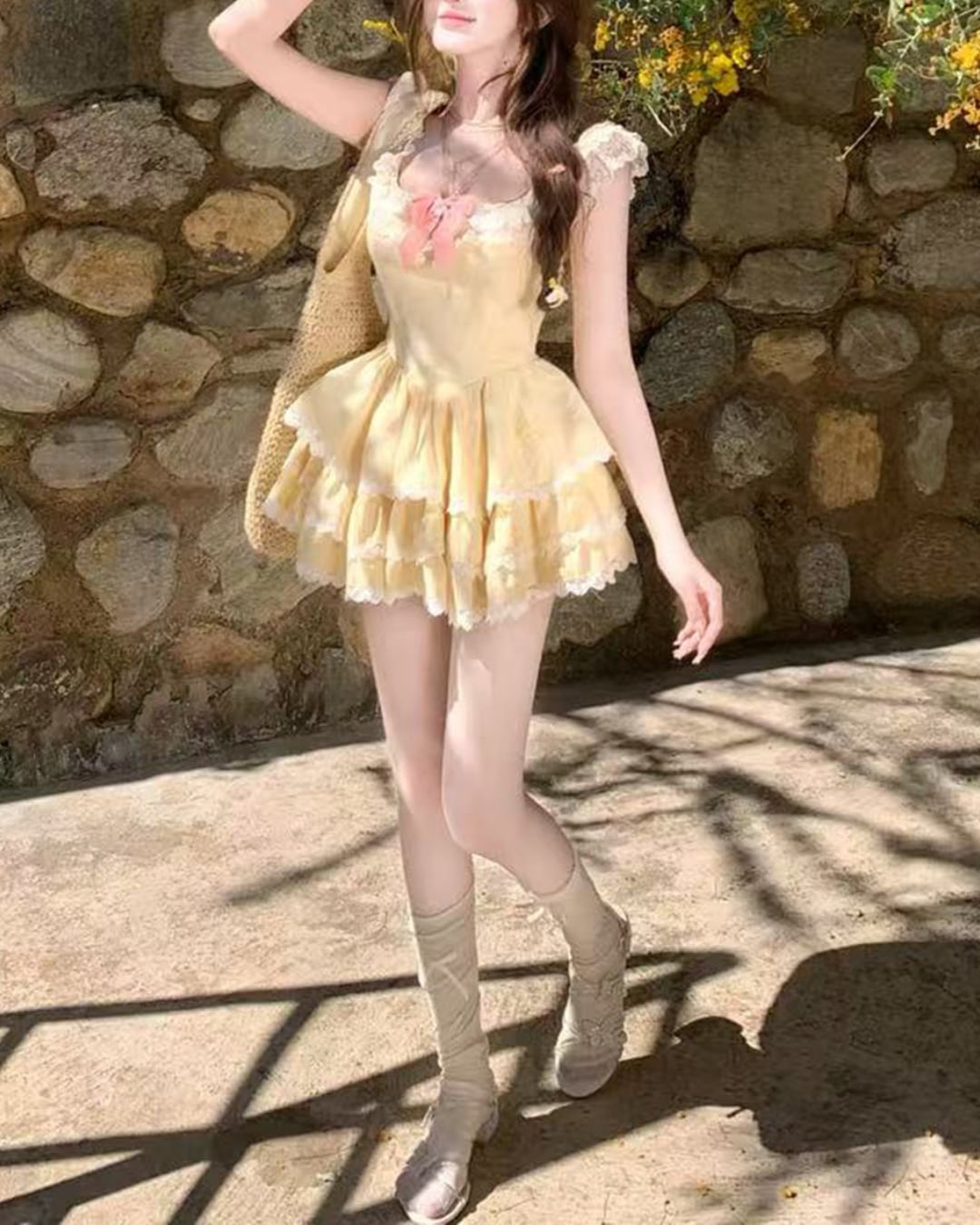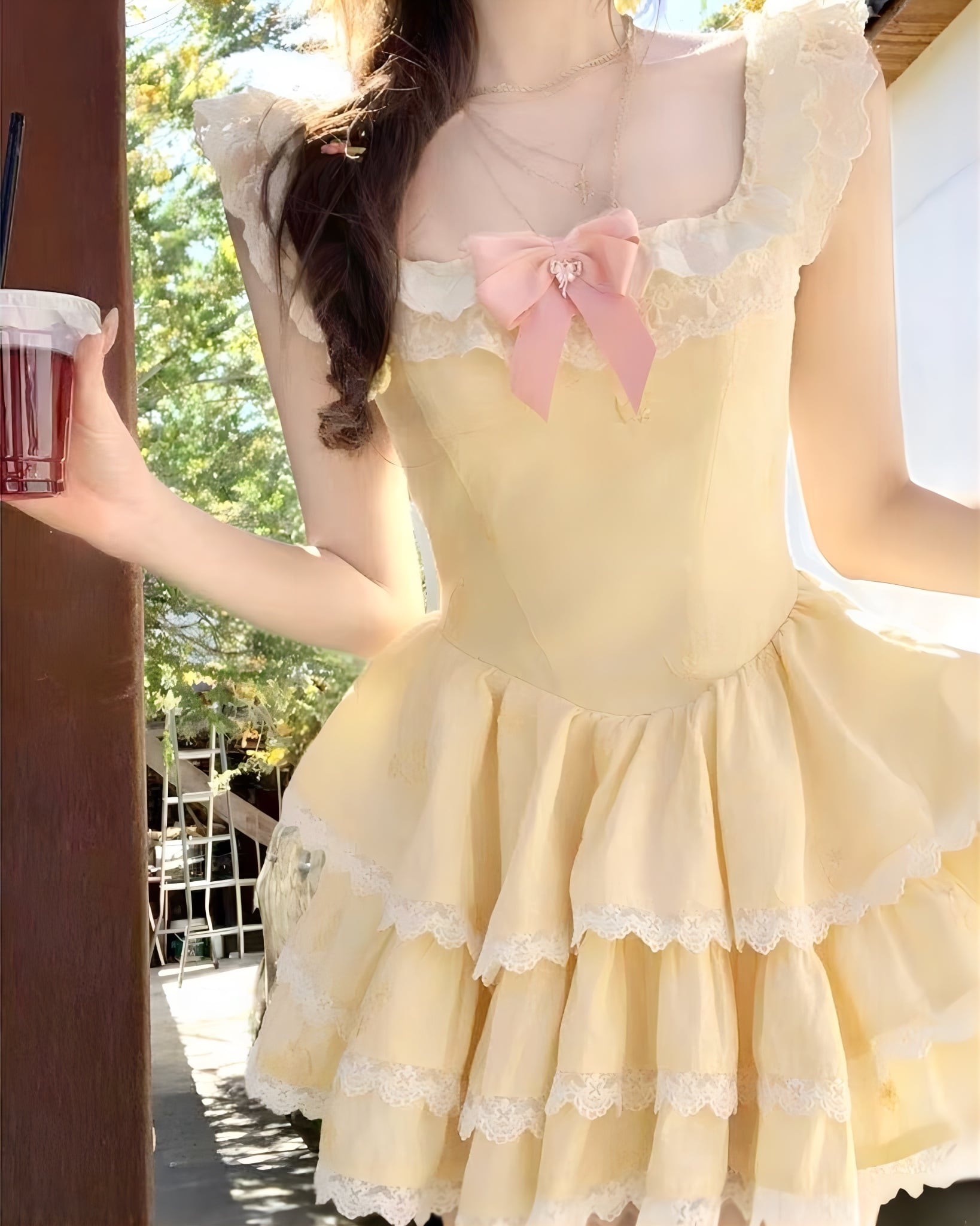 ピンクのリボンがキュートなイエローカラーのワンピース♡