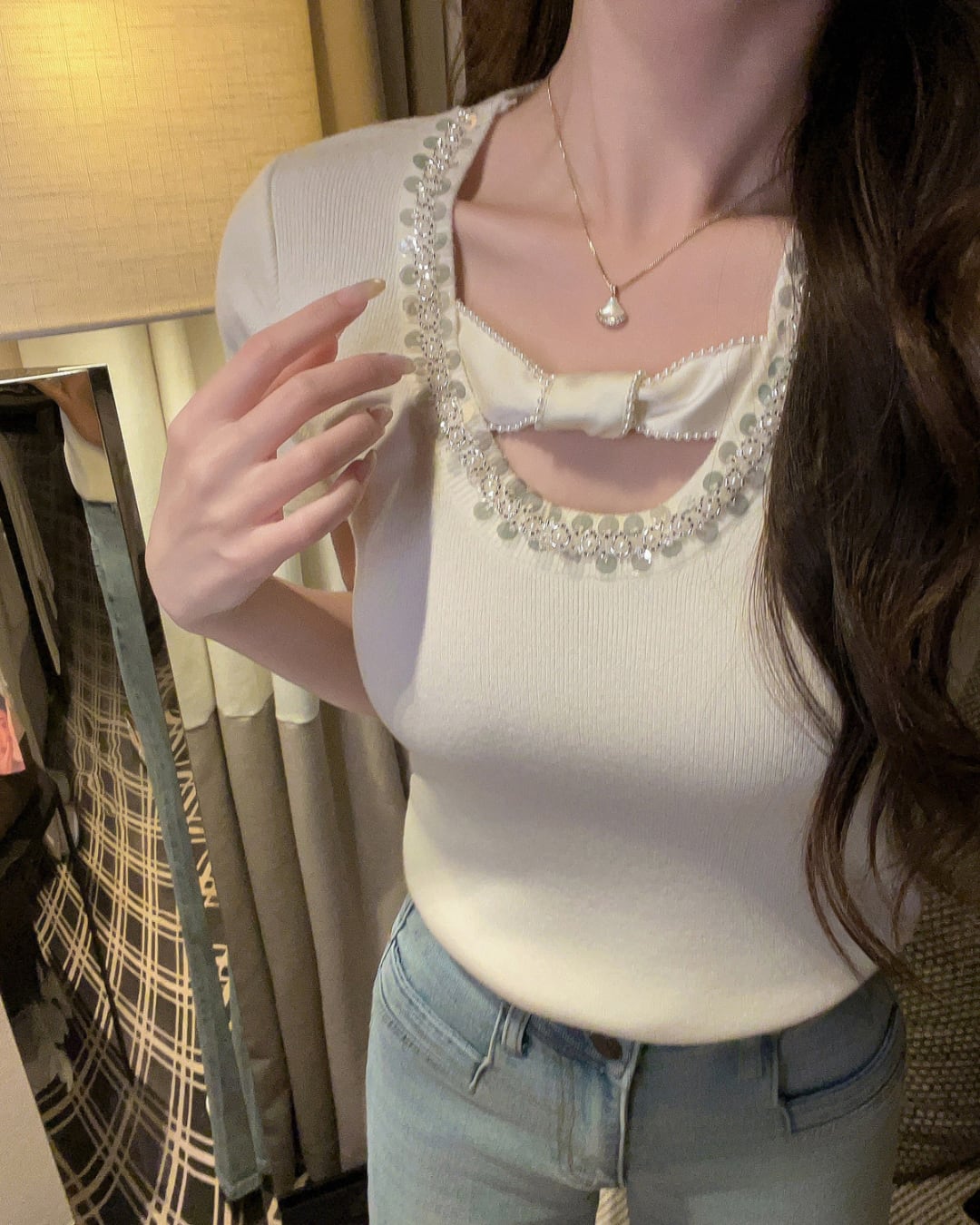 サテンリボンスパンコールネックトップス 2508579