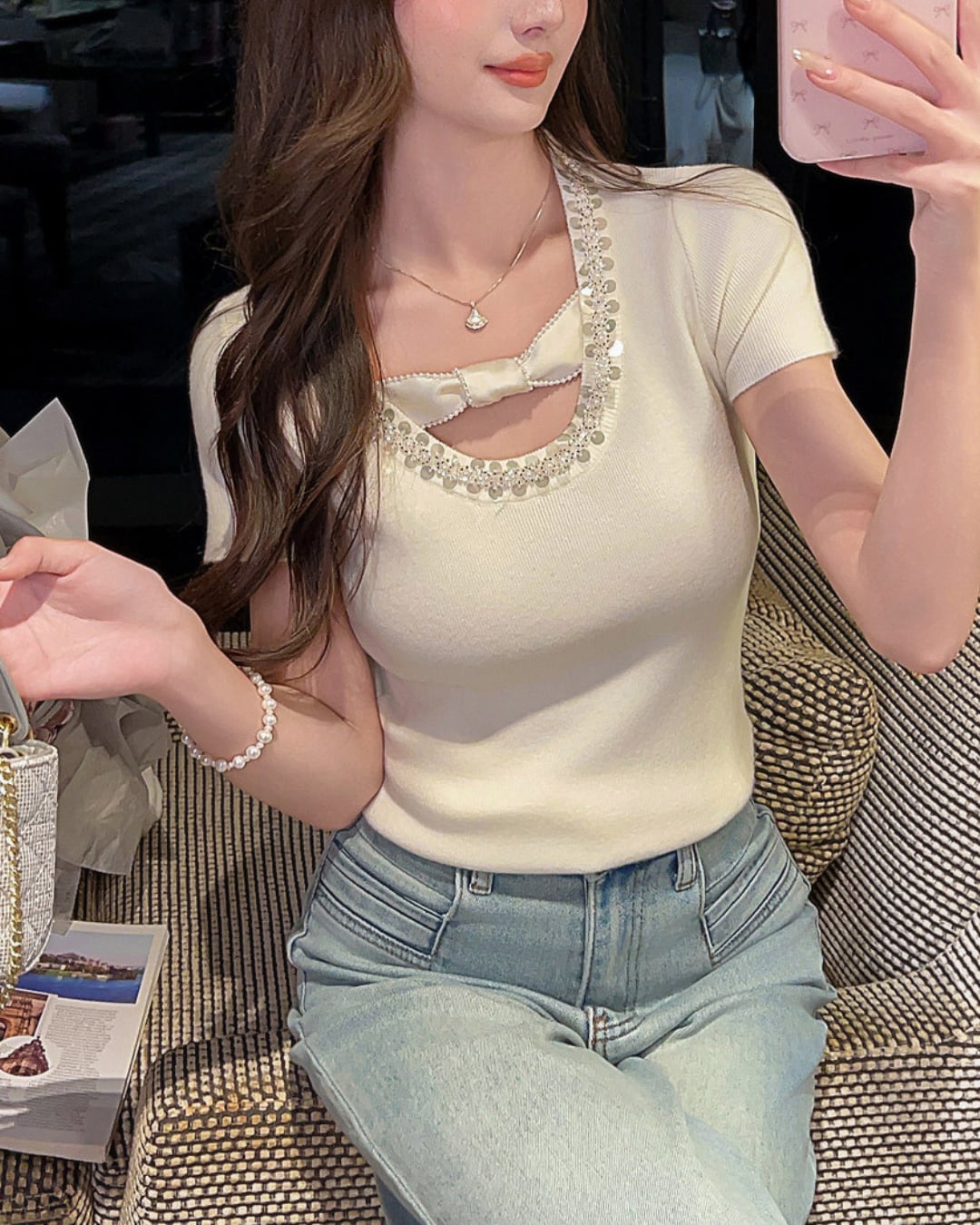 センターリボンが目を惹くニットトップス♡