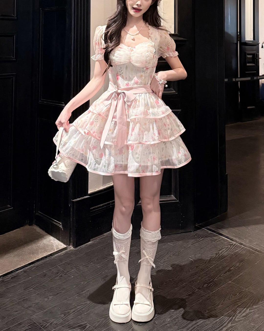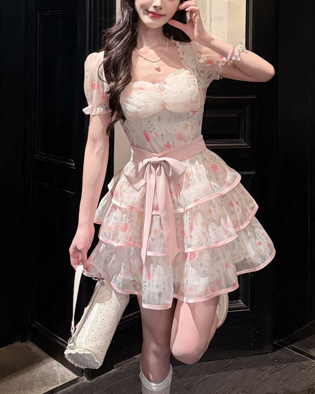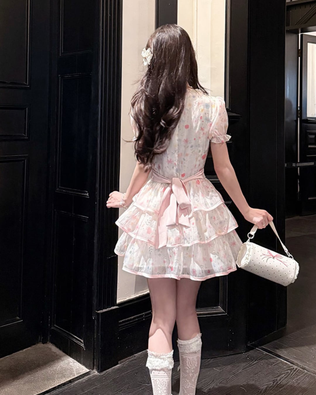 ウエストリボンと重なるフリルが、可憐で愛らしい印象を演出します.*・゚