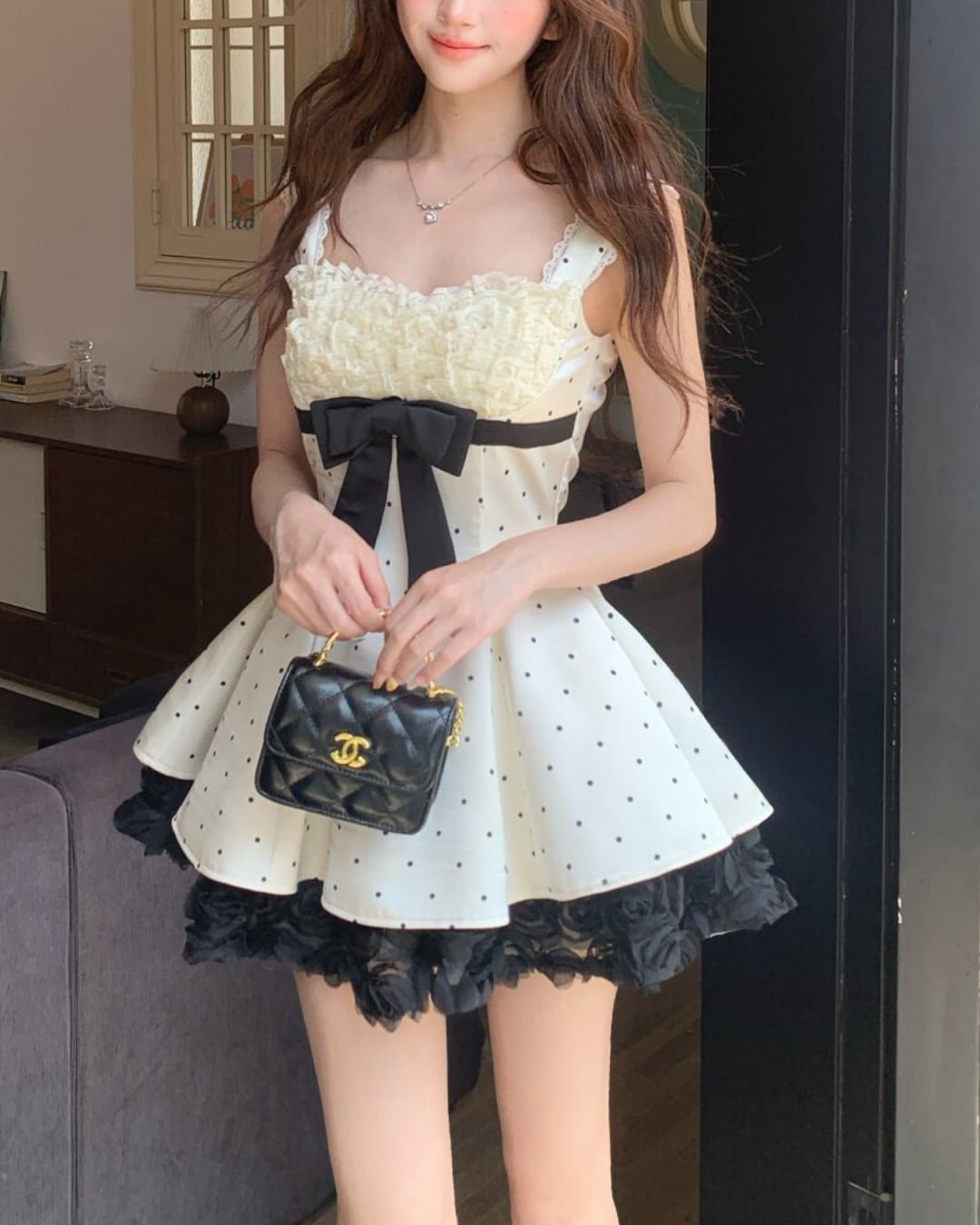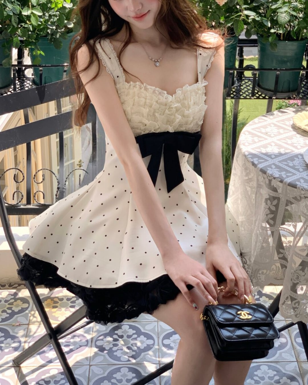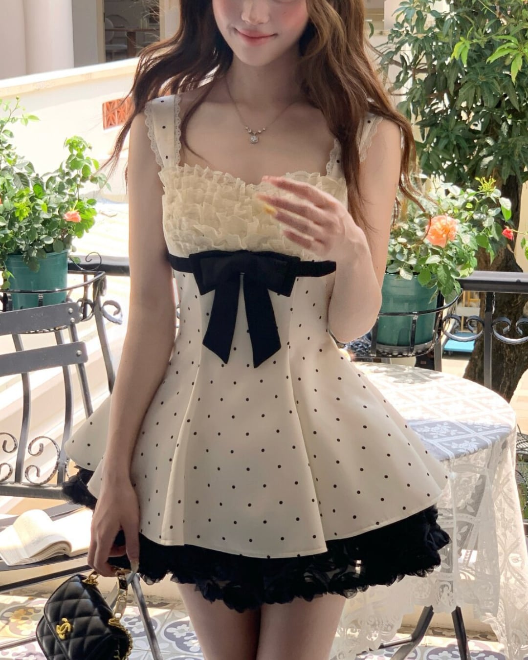 ドット柄にウエストのブラックリボンが映える、ドーリーライクなワンピース♡