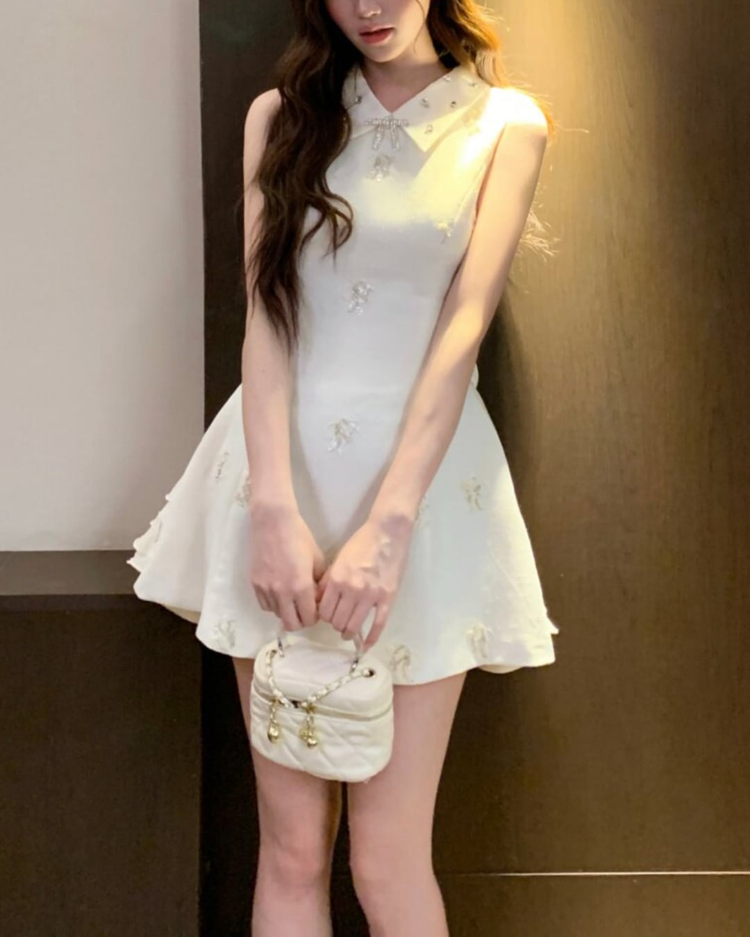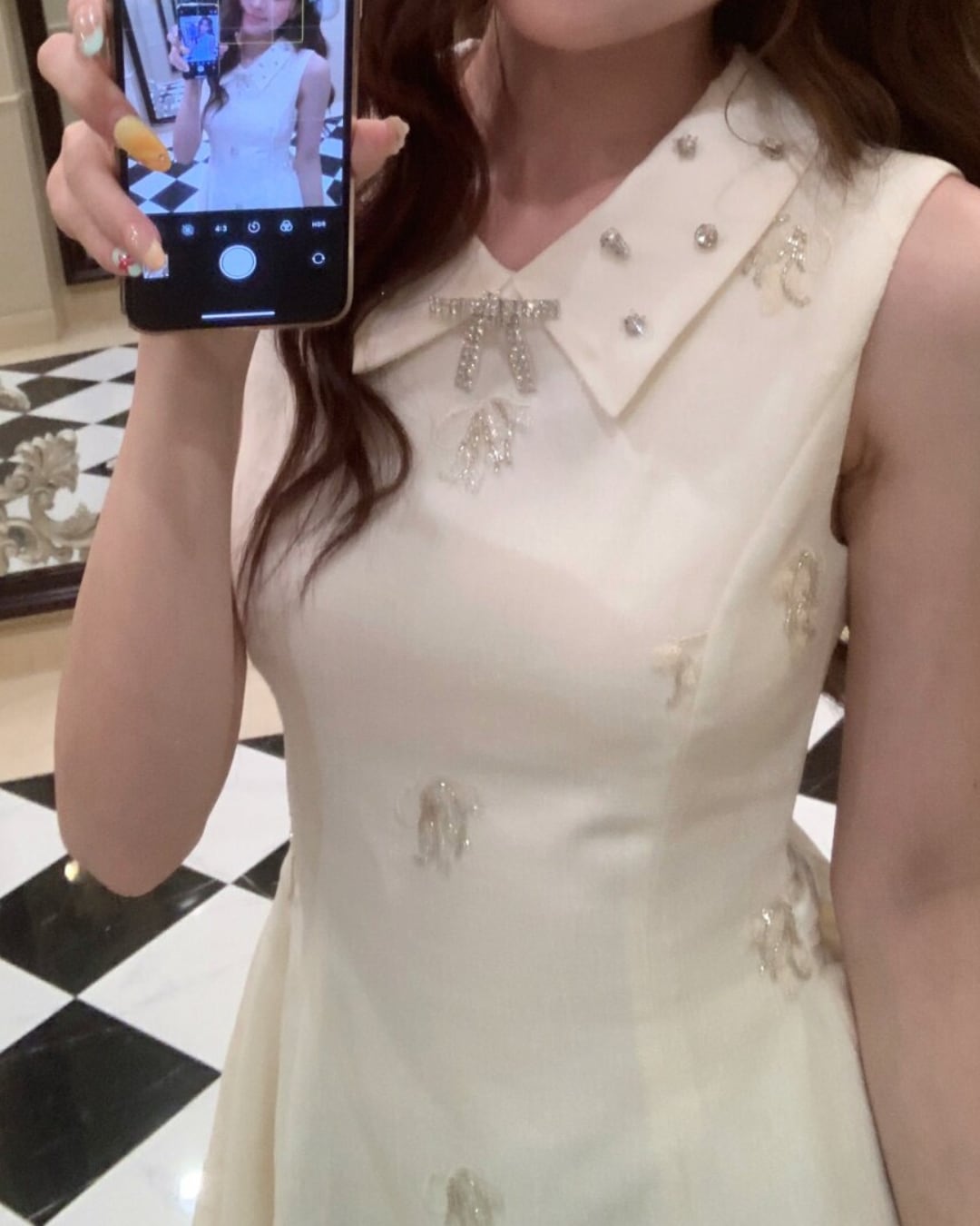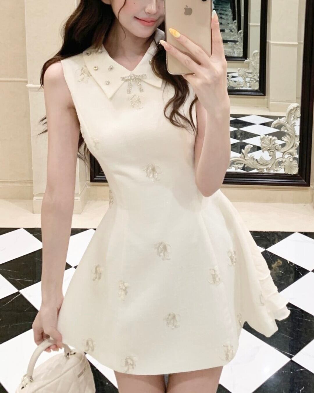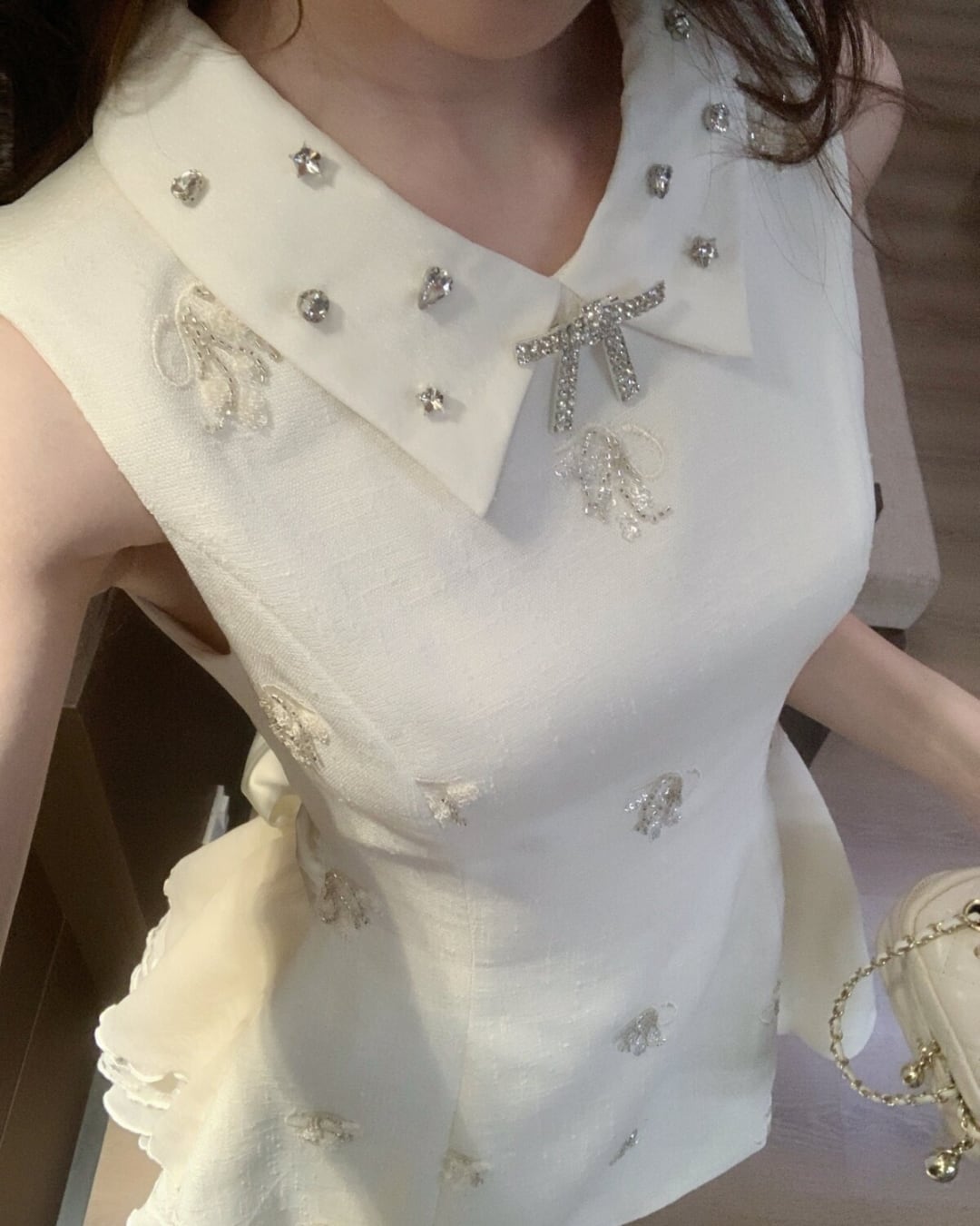 上品な襟付きデザインにキラキラビジューが輝く