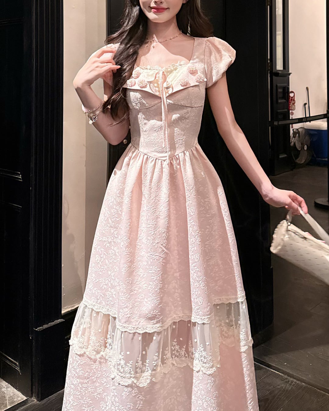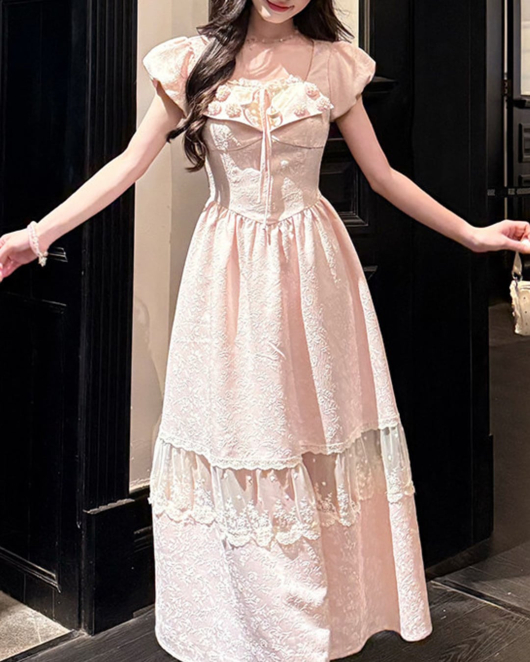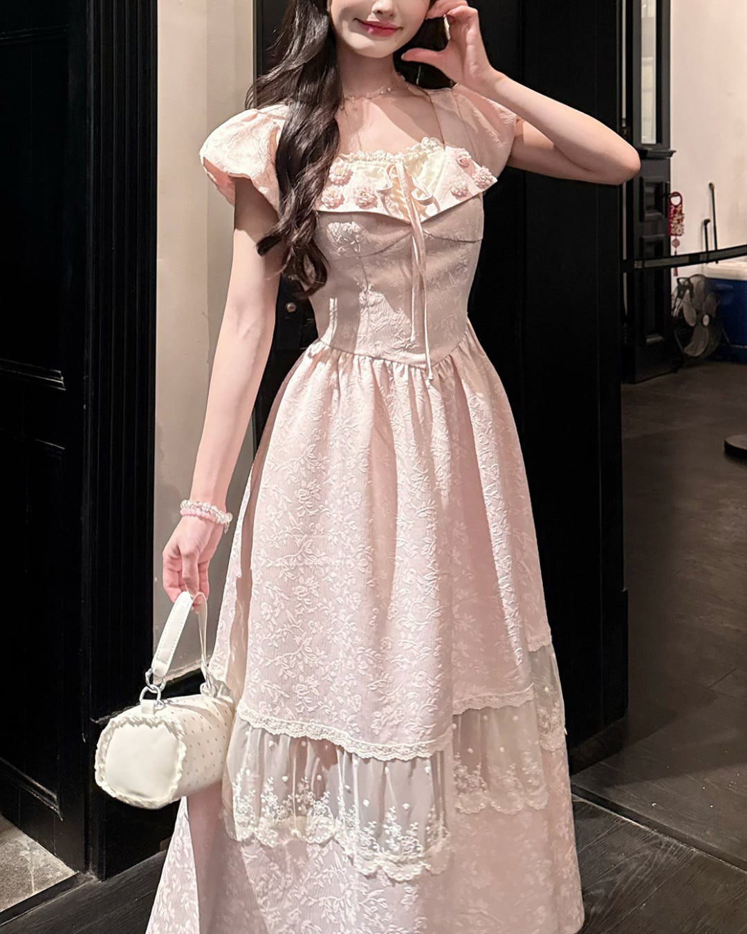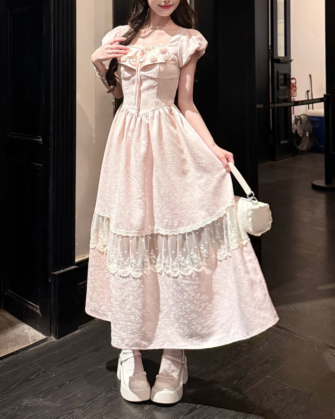 胸元のフラワーモチーフと華奢なウエストリボンが、可憐なアクセントを添えてくれます*・゚