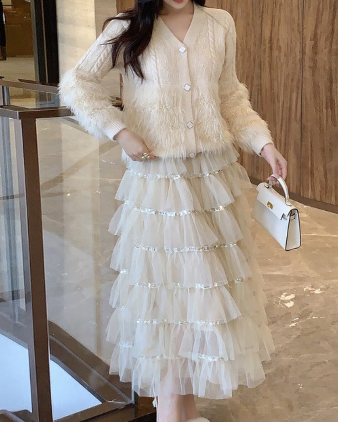 【♡お届け約1週間♡ Sサイズ ベージュ1点のみ】ファーニットカーディガン&ティアードスカートセット