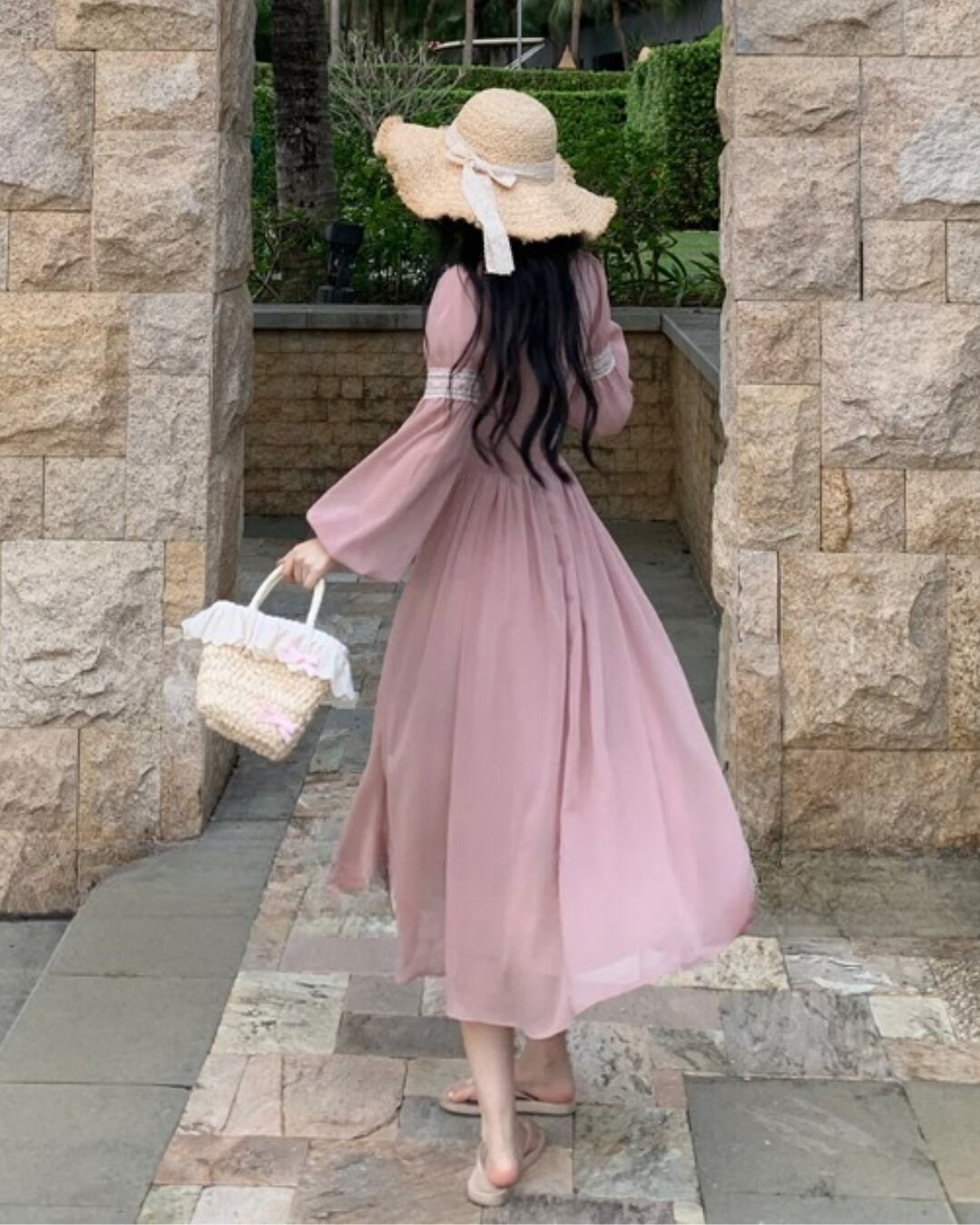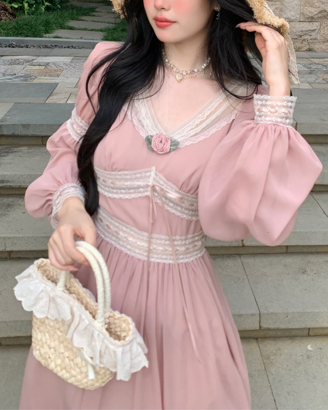 レースステッチピンクローズワンピース 24SP01005