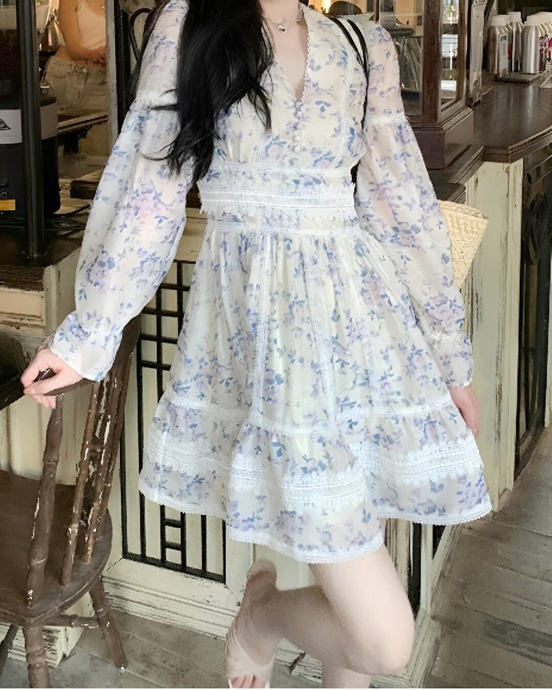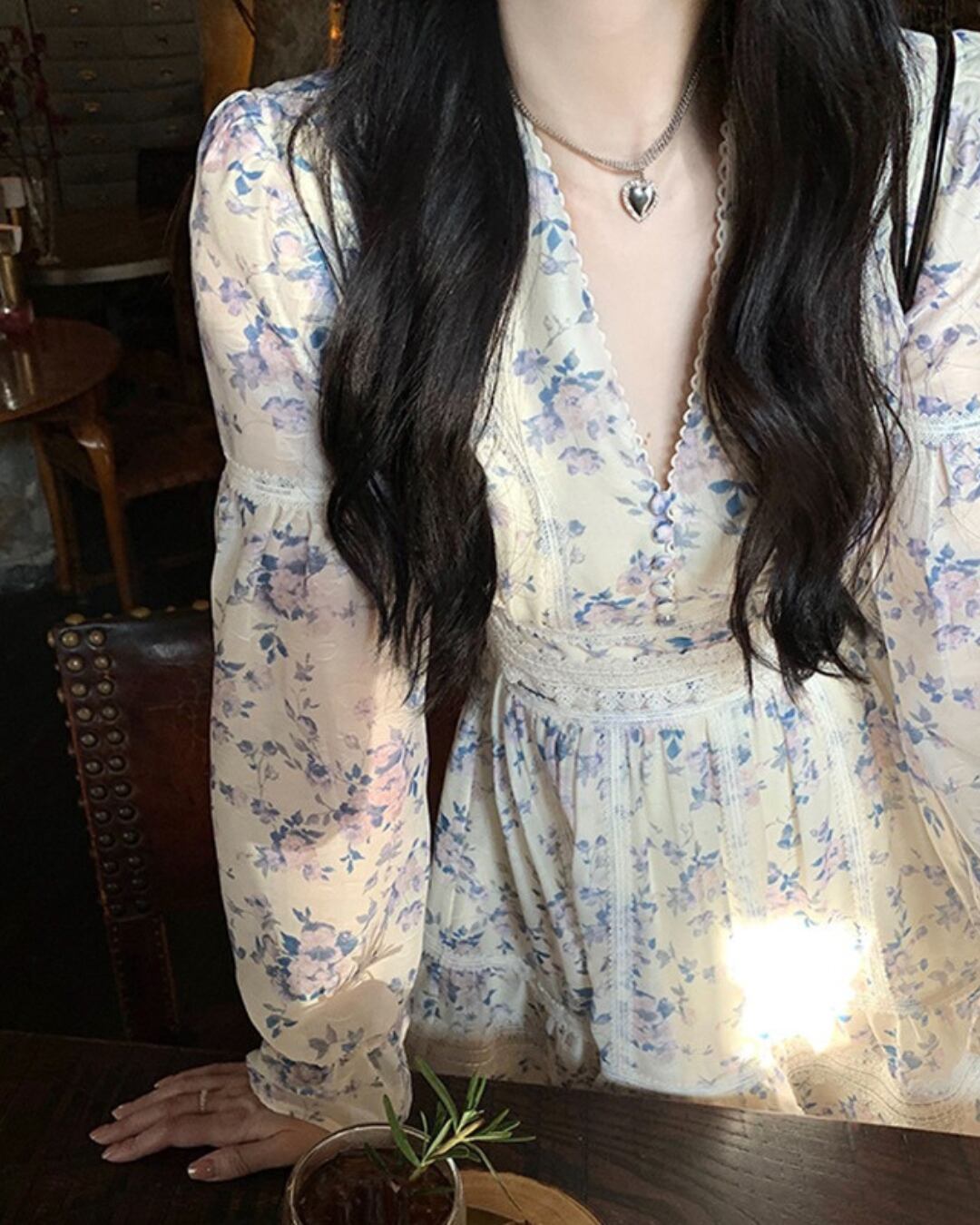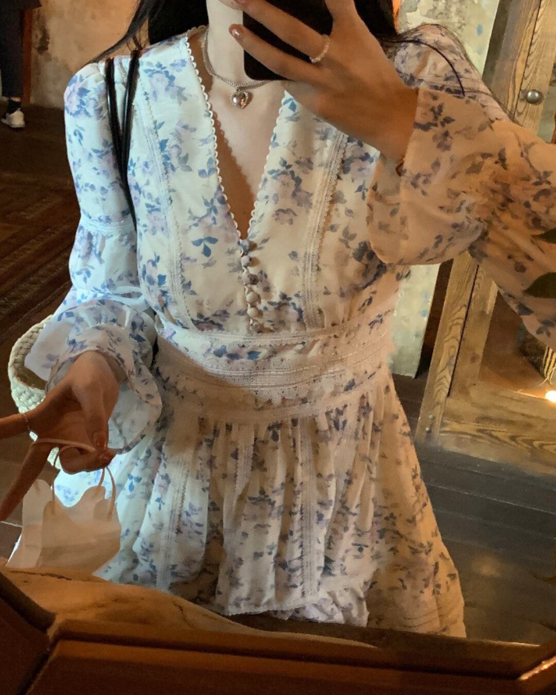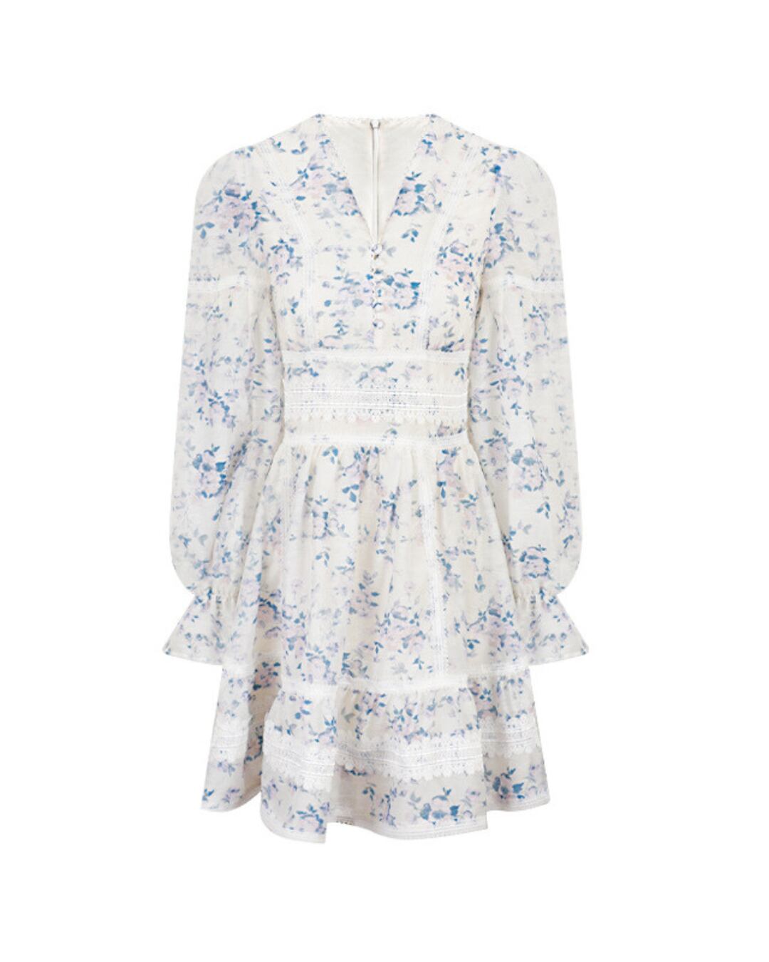 Vネックブルーフラワーレースワンピース 2404025