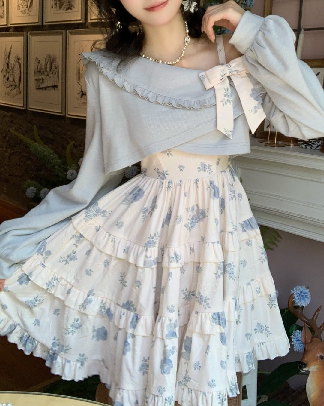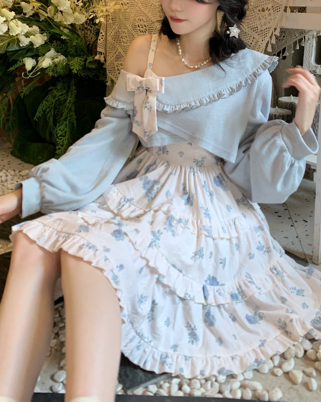 フラワーワンピース&オフショルショートトップスセット(2 colors) 24WP08090