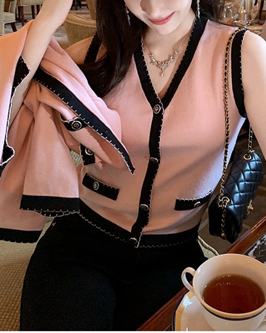 パイピングピンクカーディガン&タンクトップセット 24WP08103