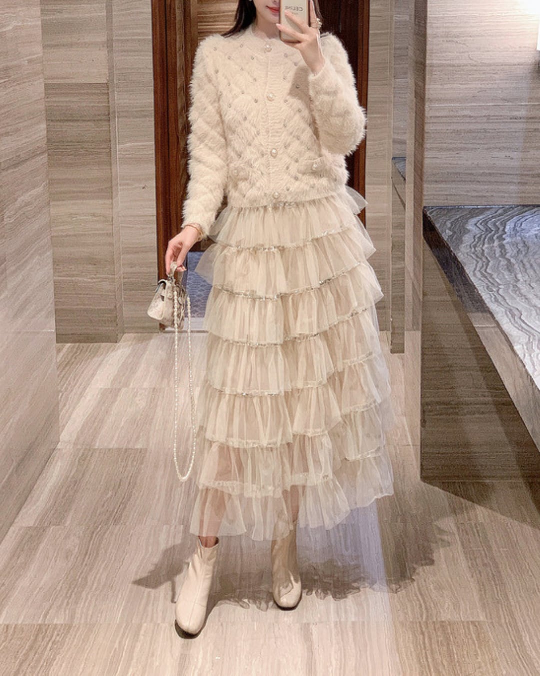 ダイヤビジューニットカーディガン&ティアードスカートセット(2 colors) 24W10005