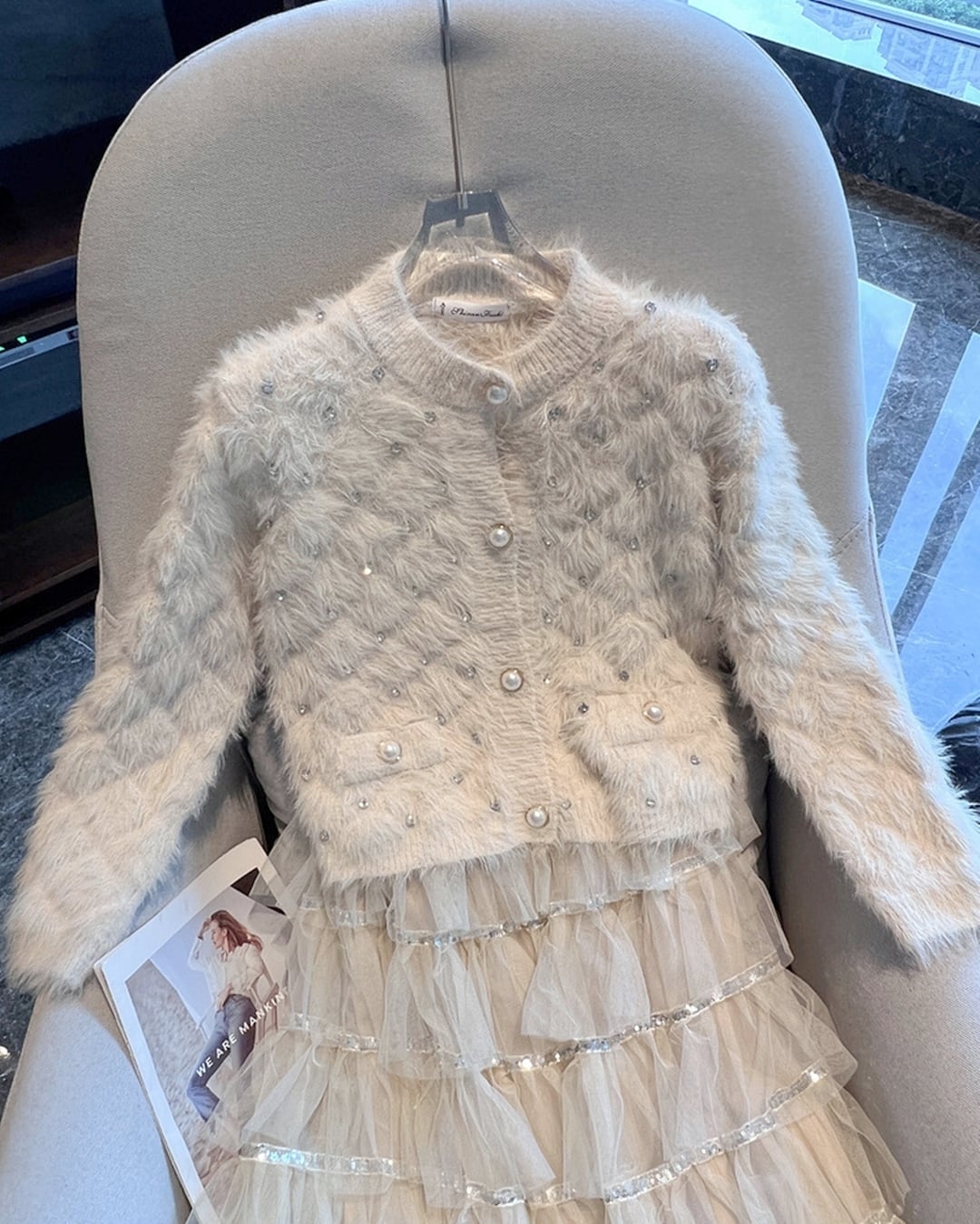 ラインストーンがあしらわれたふわふわのカーディガンと