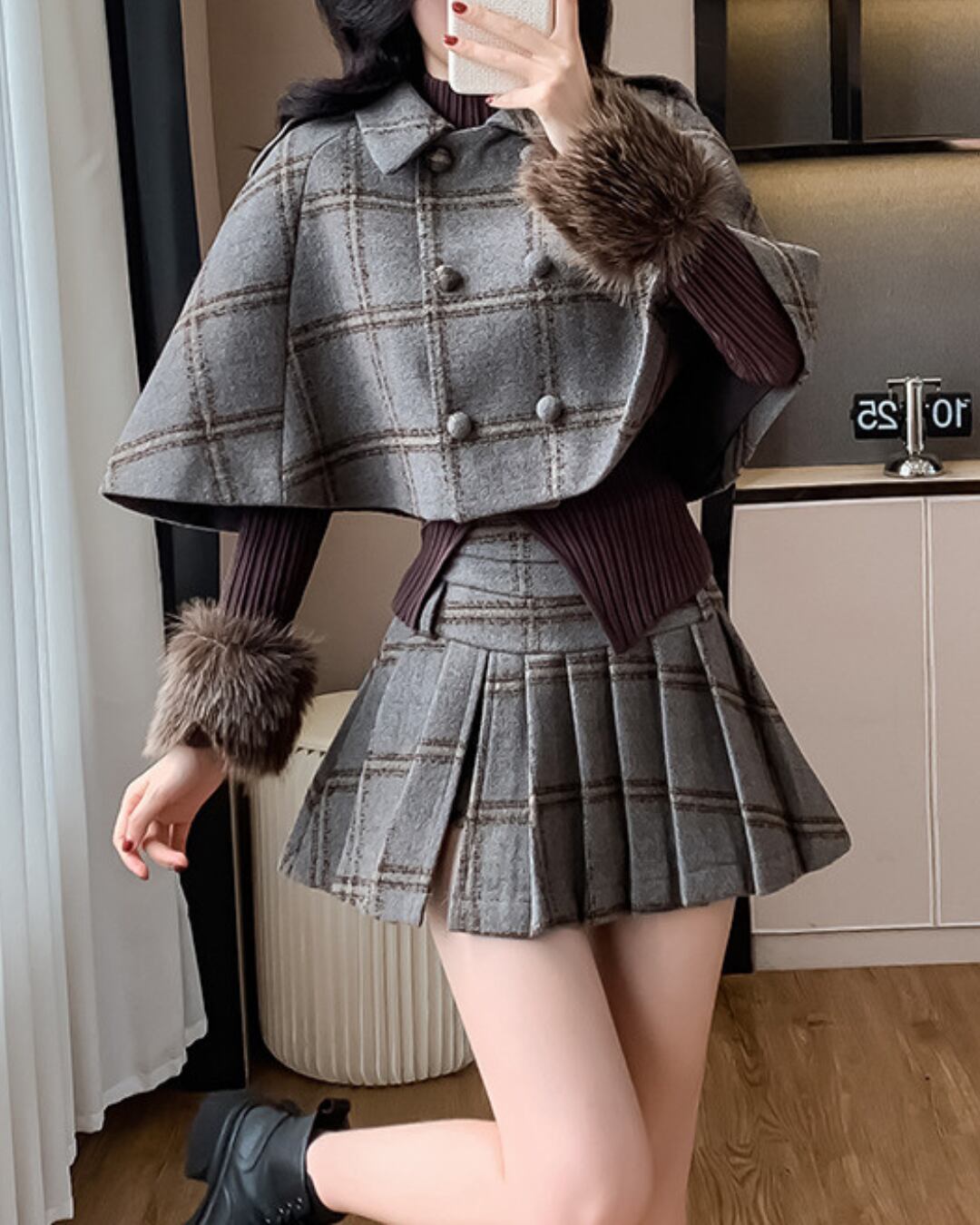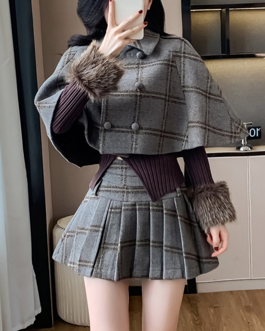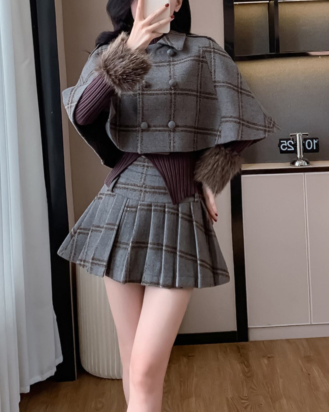 ファー付きニットトップス&チェックスカート&ケープコートの3点セットです。