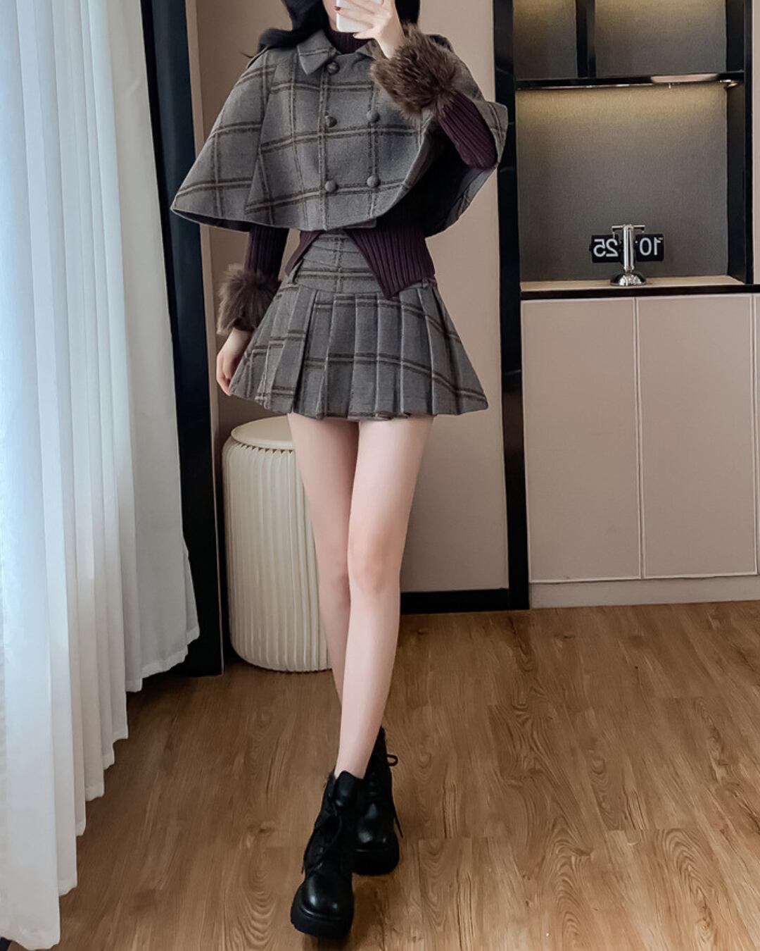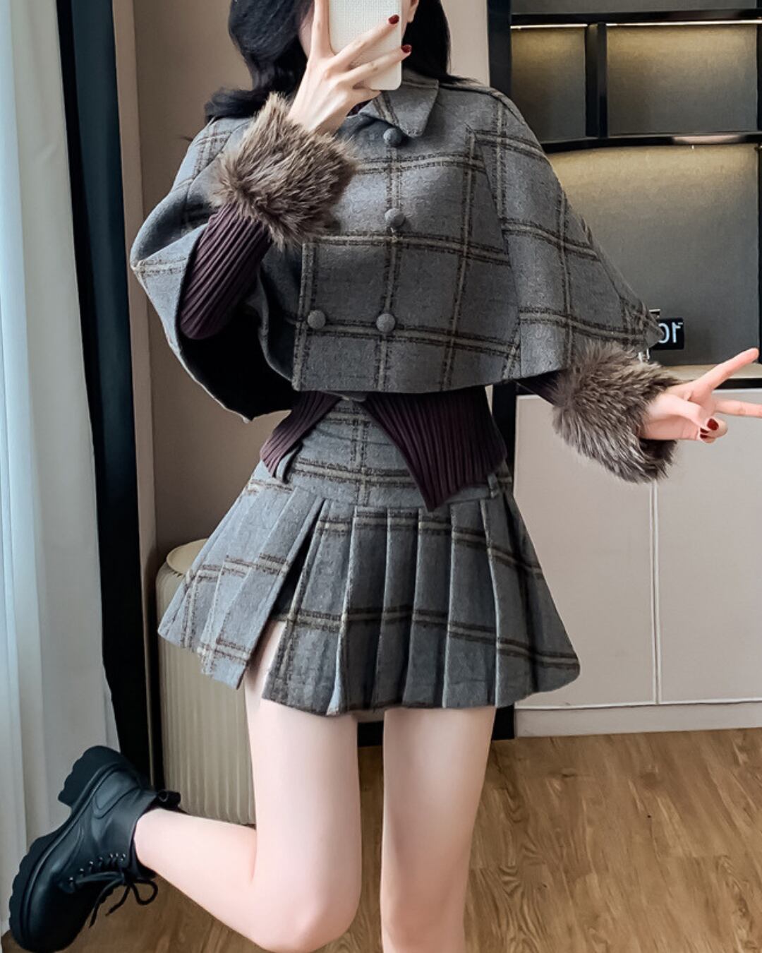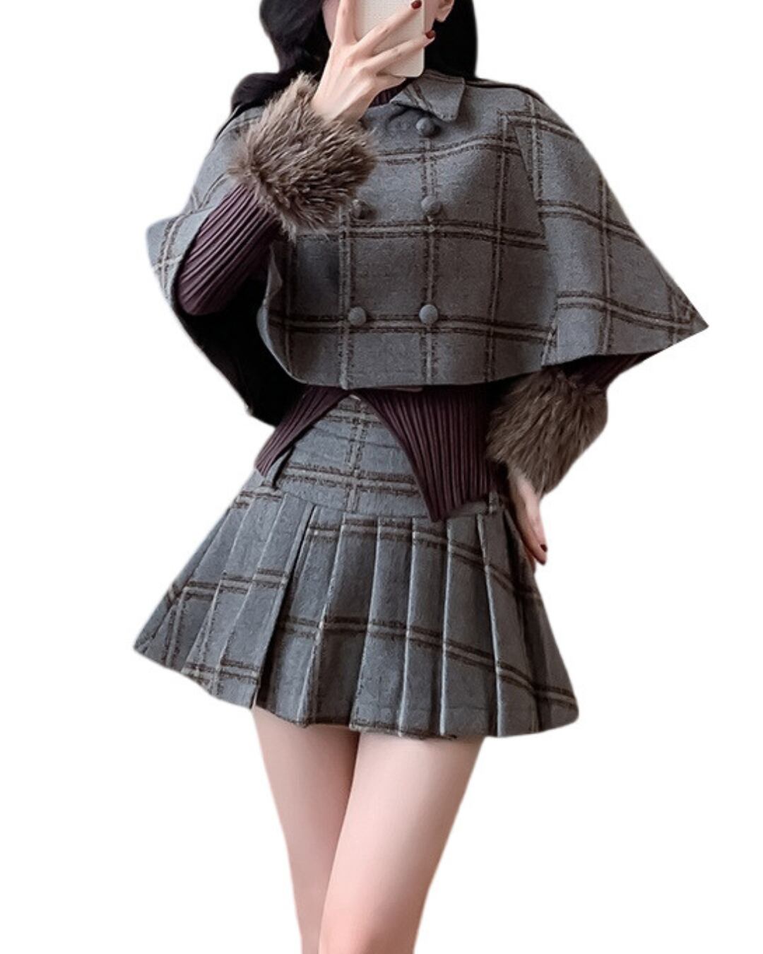 ファー付きニットトップス&チェックスカート&ケープコートの3点セットです。
