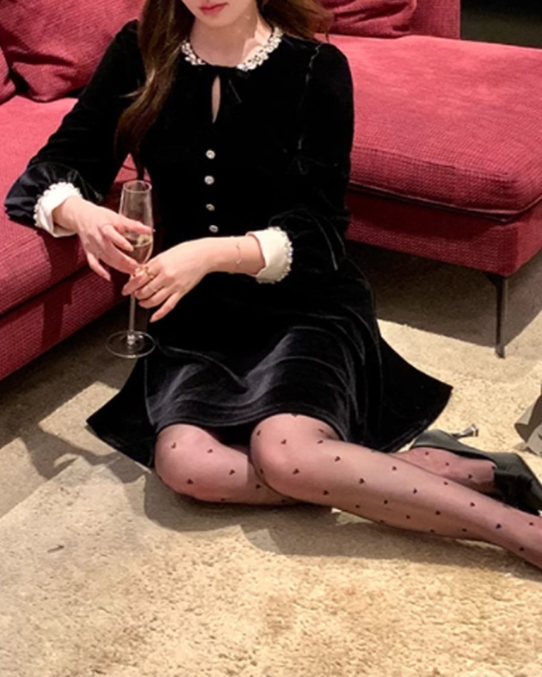 ベルベットオープンリボンビジューワンピース(ショート、ロング) 24W11061