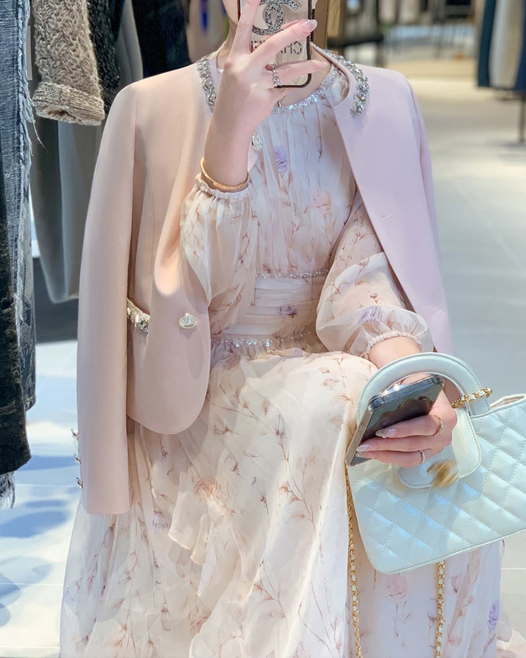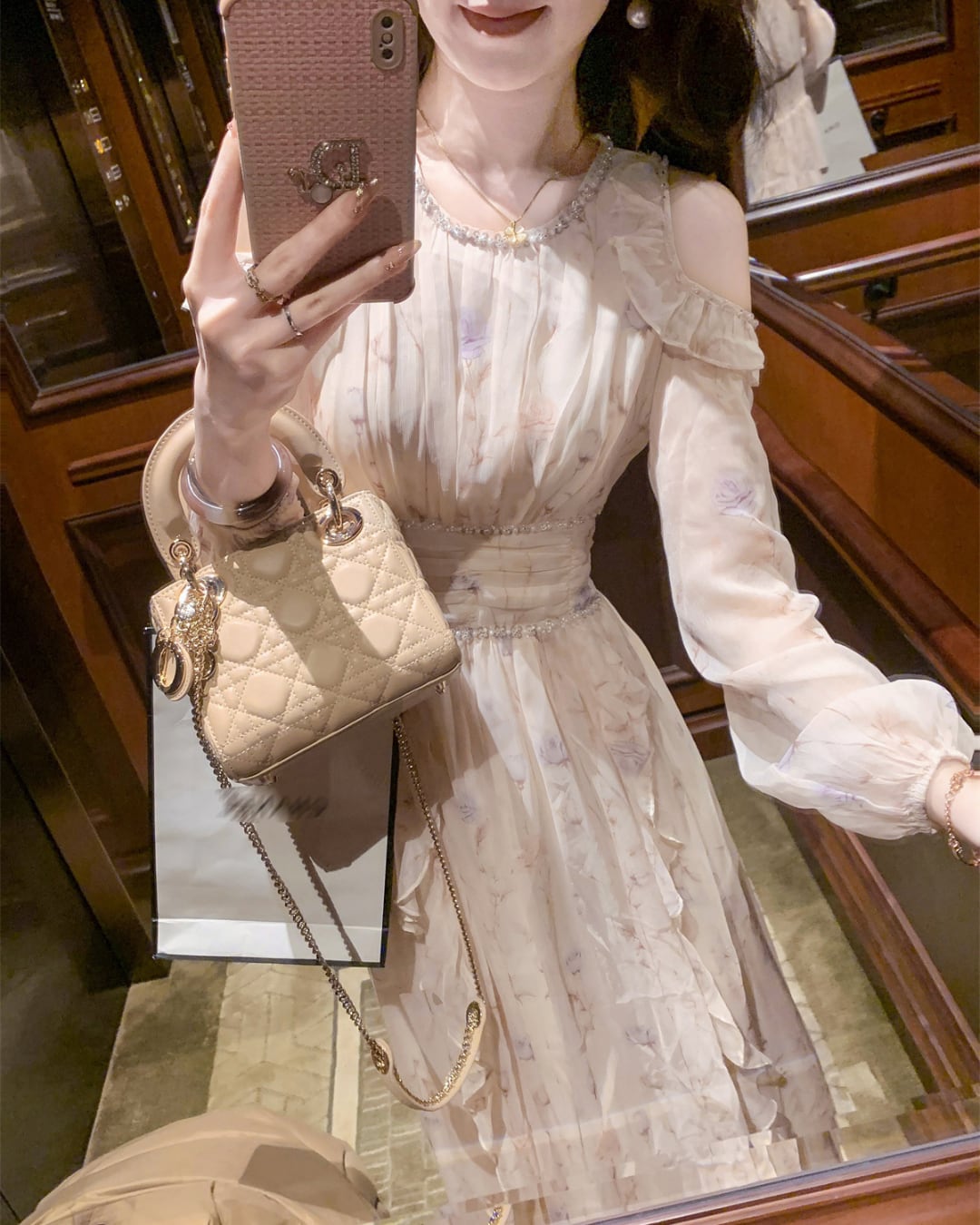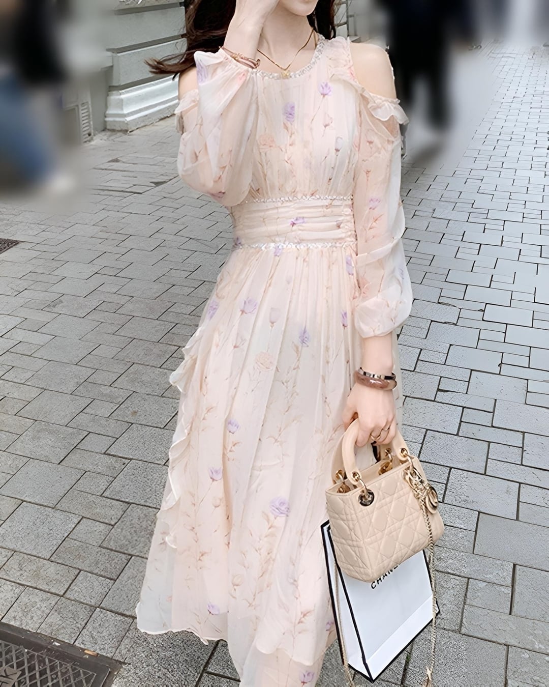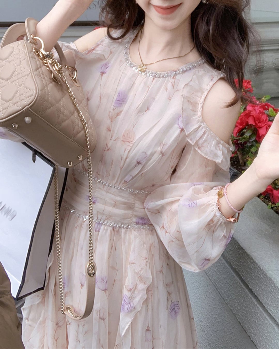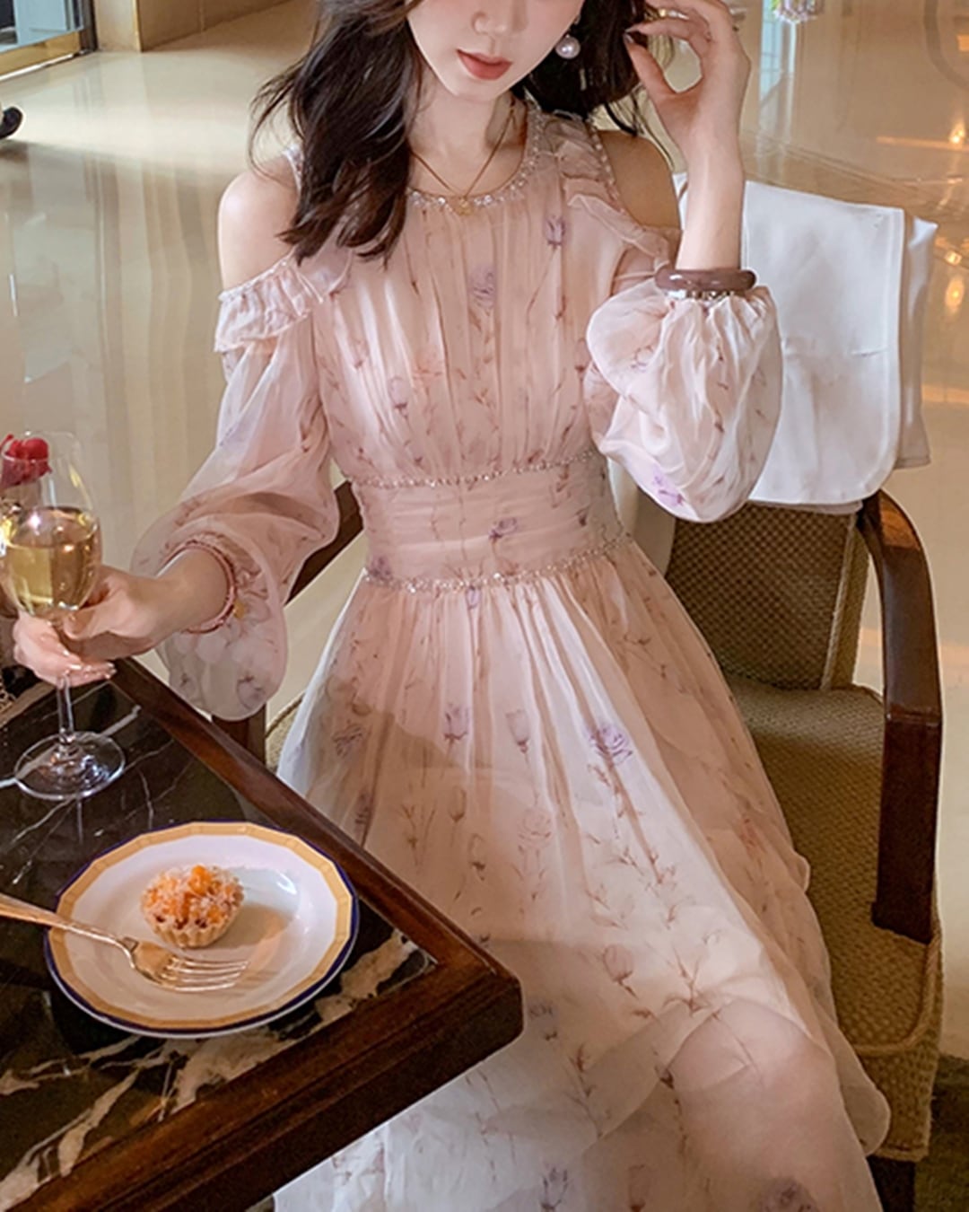 上品な肩見せと華やかなビジューの輝きが